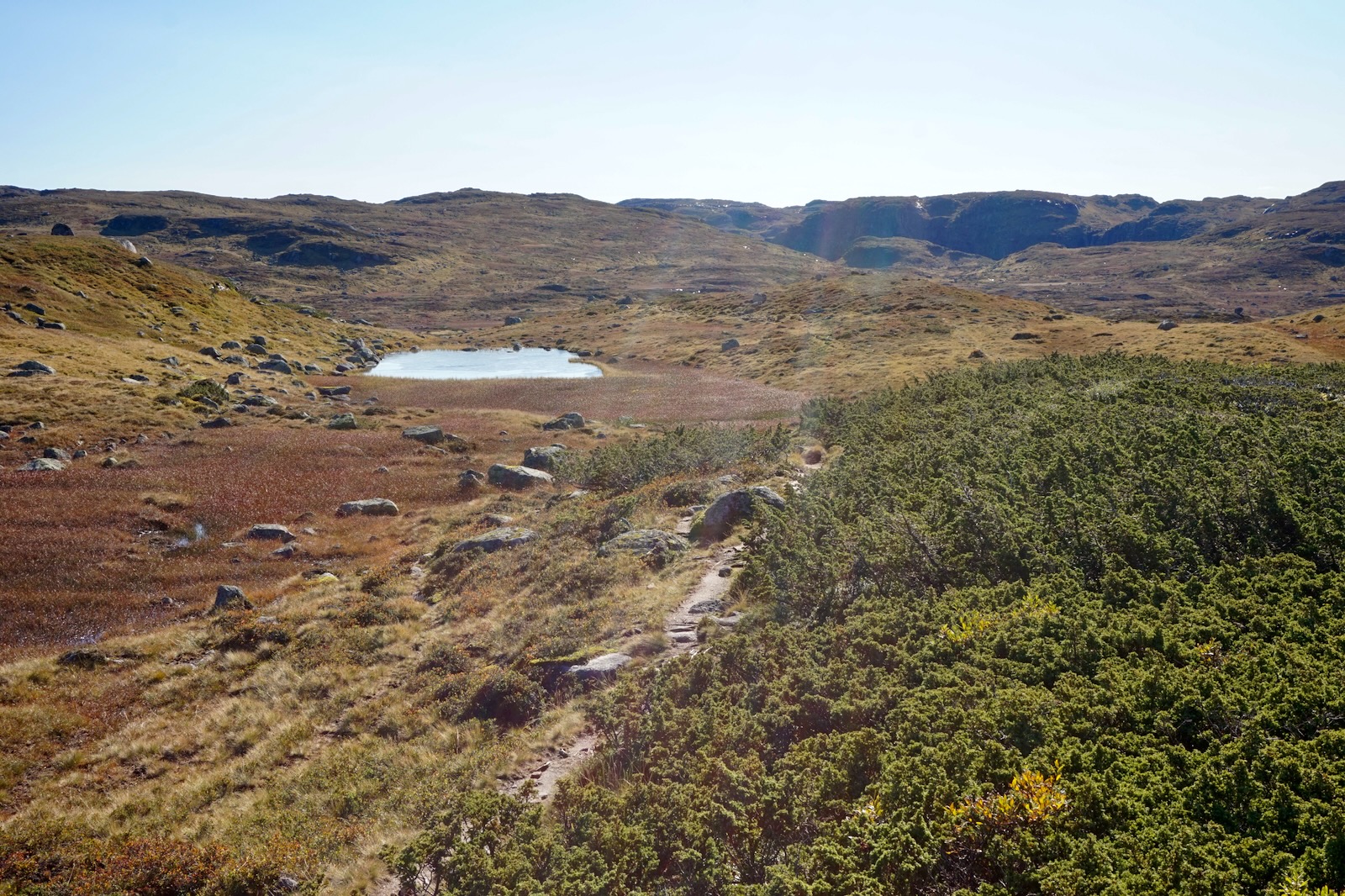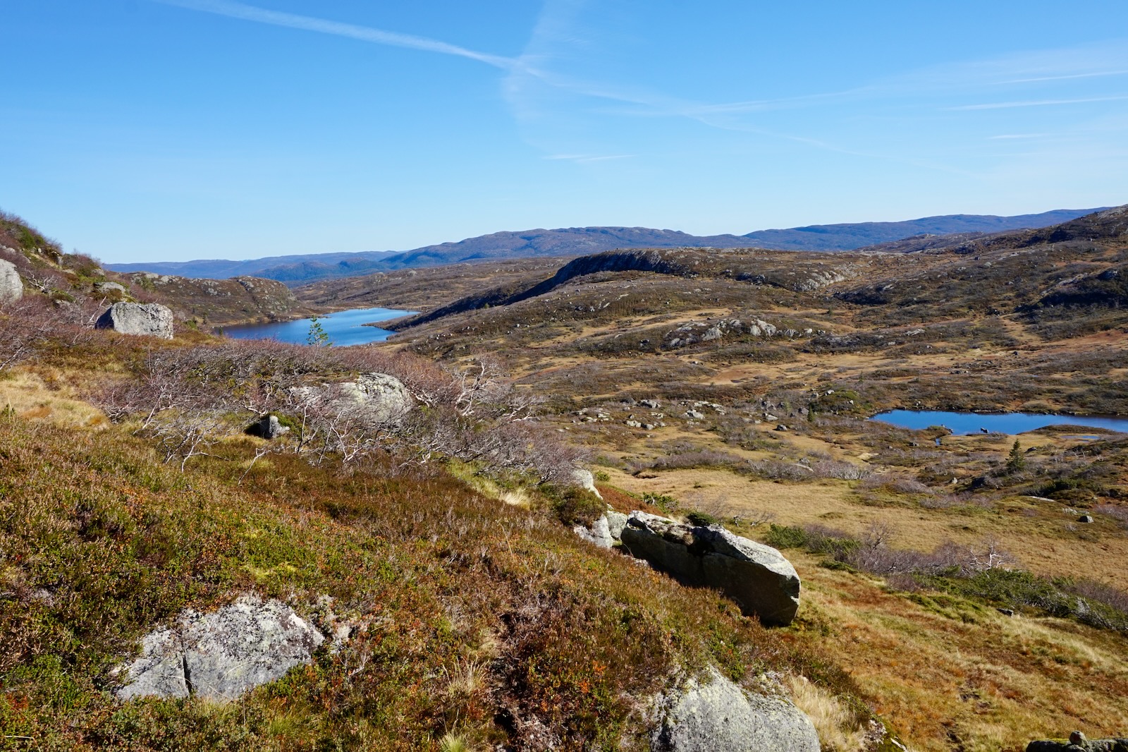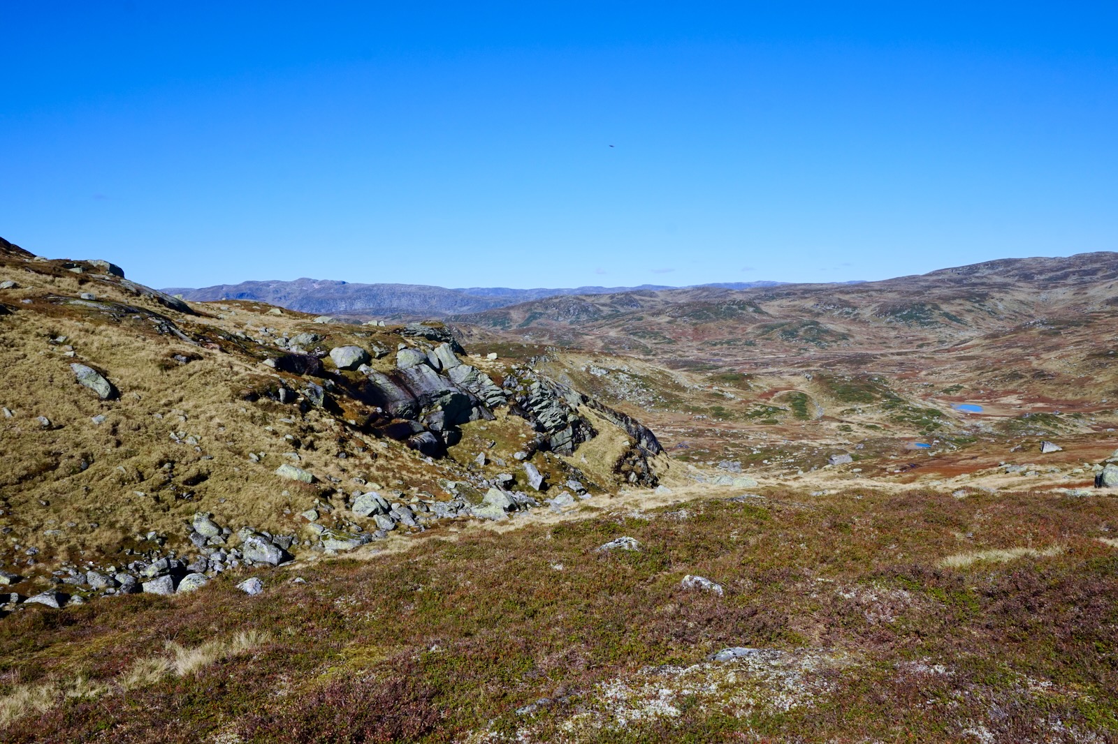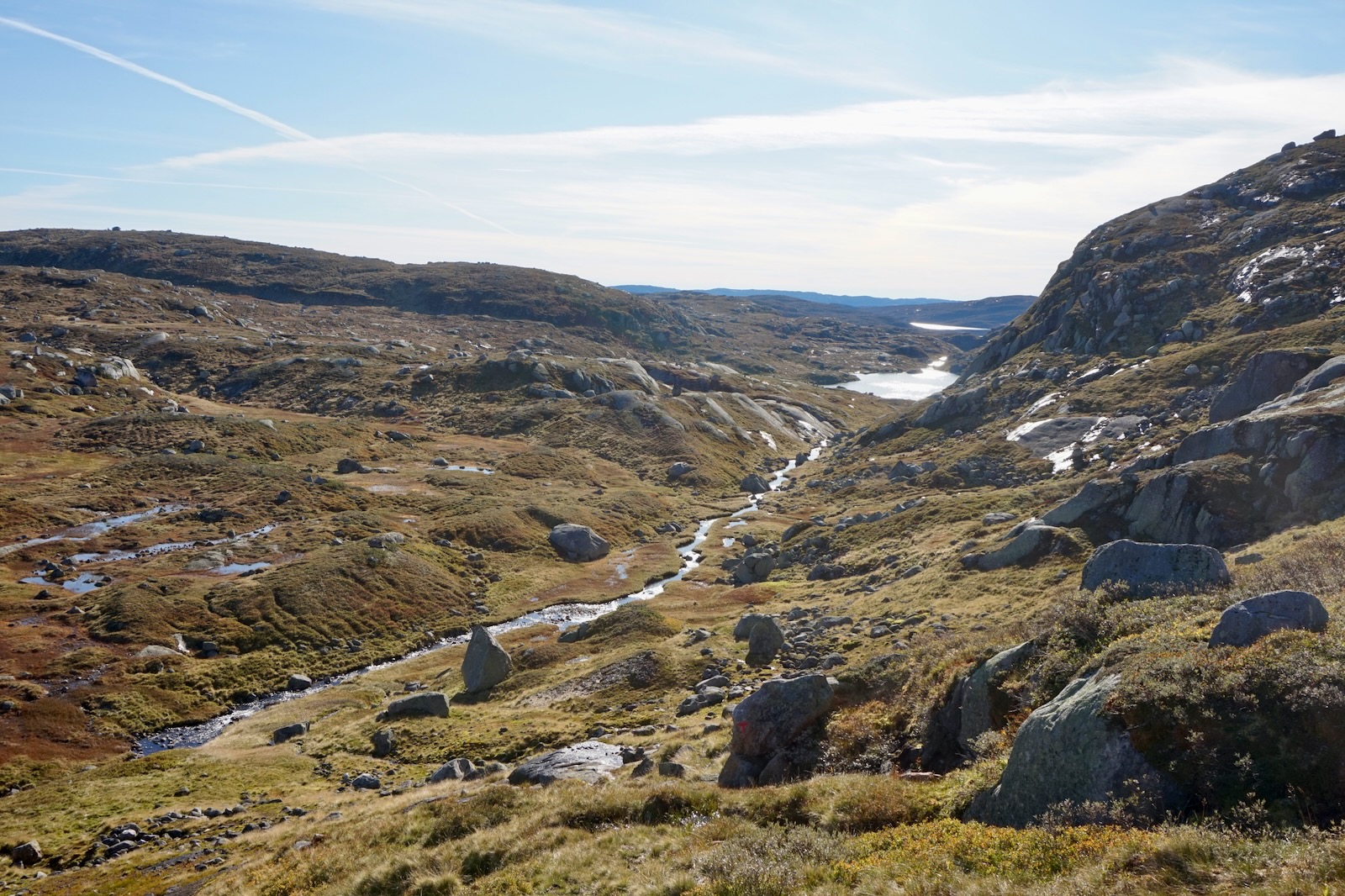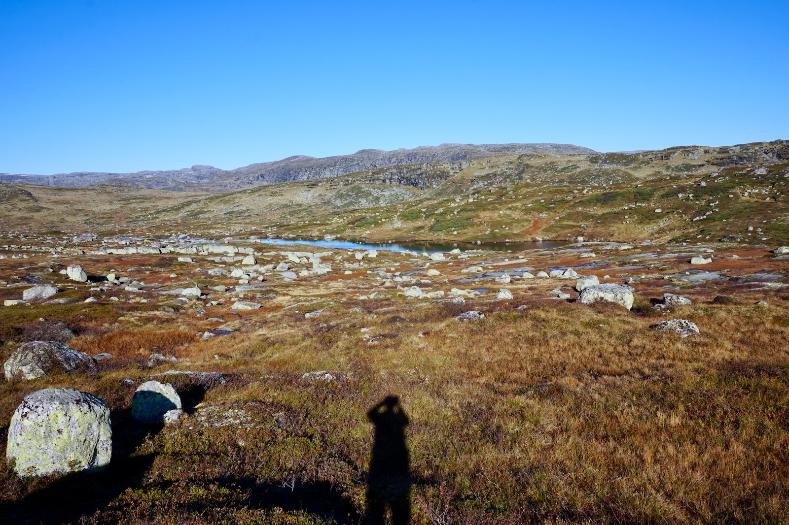 Med viss huvudvärk gav jag mig ändå i kast med stigningen upp från Valle och upp mot Dnt-hyttan Bossbu. Ifrån bilparkeringen skulle det vara ungefär sexhundra höjdmeter, så jag tog det i lugn takt. Här ser jag bakåt, efter någon timmes vandring. ![]() Uppåt. Närmare bestämt så hade jag startat ifrån bilparkeringen vid Berg, lite väster om Valle, och härifrån var det cirka femton kilometer att gå upp till Bossbu. ![]() Jag tvekar lite inför vad detta fjällområde kallas. Jag landade i att denna del nog kallas Setesdalsheiene (och det ligger också väster om Setesdalen, så det låter ju lite logiskt). Men området hänger ju också ihop med Ryfylkeheiene (som kanske är mer välkänt), och andra fjällområden, och i norr fortsätter det ju oavbrutet upp mot Hardangervidda. ![]() Ungefär halvvägs passerar man den obetjänta Dnt-hyttan Stavskar, där jag stannade för en paus. Det var en blåsig dag, så det var skönt att få komma in och få lite lä. Jag tog en bild på stugan men lyckades då få ett stort stenblock att effektivt skymma nästan hela. Den lilla stugan Stavskar ligger där bakom, hur som helst. ![]() Fortfarande uppåt. ![]() Någon kilometer efter Stavskar var man uppe på lite drygt 1200 meters höjd, som var dagens högsta punkt. Därefter blev landskapet västerut lite jämnare. ![]() ![]() ![]() Ganska flott landskap, och höstfärgerna gör ju sitt till. ![]() Längst bort syns sjön Botnsvatnet, vid vars hitersta ände Dnt-hytten Bossbu ligger. ![]() ![]() ![]() Framme vid Bossbu äntligen. I den mindre hytten till höger bodde en far och dotter ifrån Tyskland, och i stugan till vänster bodde jag den här natten, tillsammans med två trevliga karlar från Oslo som var på tur tvärs genom området. Deras mål var Lysebotn vid Lysefjorden, som de nådde någon vecka senare. ![]() Nyss inkommen i stugan. Bossbu byggdes för ett tiotal år sedan, och är väldigt funktionell. Och fin! ![]() Så fin! Värmen efter tidigare gäster hängde fortfarande kvar i stugan, som kändes väldigt välbyggd. ![]() Dagen efter, och jag kände faktiskt inte alls för att lämna stället. Jag ville sitta här i den sköna värmen från kaminen och titta ut på busvädret utanför hela dagen. Kanske somna lite i soffan. Mina nyfunna vänner från Oslo hade lämnat stugan tidigt på morgonen, de hade en lång vandringsdag framför sig. Det var så tyst i huset. Ibland rystade vinden i stugan så att knutarna knakade, men annars var det alldeles tyst. Efter en stund tycktes vädret bli lite bättre i alla fall... och jag kunde inte längre förtränga det faktum, att om jag skulle ha någon chans att hinna gå den sträcka jag tänkt, så hade jag inte råd med några vilodagar! Jag packade så småningom mina grejer långsamt, långsamt. ![]() ![]() Snön hade lagt sig på de högre bergen där borta under natten. ![]() Till slut lämnade jag Bossbu ändå. Det var fortfarande kyligt i luften, men det skulle komma att bli en fin dag! ![]() Jag var på väg söderut mot den självbetjänta DNT-hyttan Svartenut. Det var bara lite drygt en mil dit, skönt efter stigningen igår. ![]() Men fortfarande återkom ovädret då och då, snöflingor yrde i luften när jag kom över krönet mot Auguntjørnin. Jag gick utefter sjön under någon kilometer, på en ganska besvärlig stig. ![]() ![]() Fortsatte sedan att följa denna vackra dal mot sydväst ända fram till stugan. ![]() Svartenut, där jag tillbringade natten. Det hade varit jag och en tjej ifrån Nederländerna (och hennes hund) där. Hon var väldigt trevlig, och också lite eljest! ;) Hon tyckte om att gå barfota i fjällen, och när jag förmodligen verkade lite skeptisk så berättade hon att hon till och med varit uppe på Fannaråken barfota :o Respekt från min sida – även om jag kanske menade på att man behöver ju inte göra allting bara för att det går! :D ![]() Vilket underbart höstväder! :) ![]() Dessa bilder togs på morgonen, och det spritte i benen av förväntan! Vad skulle vandringen bjuda på denna fina dag? ![]() Ja, det första som skedde var ju att jag skulle försöka korsa den här älven på ett så torrskott sätt som möjligt... Det gick inget vidare. Skorna blev genomblöta, men jag kände att det inte spelade så stor roll – så länge som det inte blir kallt så stör det mig inte så mycket om skorna blir blöta. Och denna dag värmde solen ordentligt! :) ![]() Farväl, Svartenut. ![]() ![]() ![]() Wow. Utsikten över Roskreppfjorden var fantastisk. ![]() När jag ser på dessa bilder nu i efterhand kommer jag också att tänka på boken "Hundra år av ensamhet" som jag började lyssna på den här dagen, och därefter sträcklyssnade på till slutet! En speciell bok, minst sagt. ![]() Otroligt fint. Och så ensam jag var – jag mötte ingen alls på stigarna under de sista tre dagarna. ![]() ![]() Stigen gick upp och ned i maklig takt, det var sällan stora höjdskillnader. ![]() På det stora hela var det väldigt lättvandrat. ![]() Porlande bäckar och varierad grönska gjorde mig glad! ![]() Jag följde Dnt-stigen rakt söderut mot hyttan Øyuvsbu, en vandring på cirka femton kilometer. ![]() ![]() Inte ett moln på himlen. Det är såna här höstvandringar man drömmer om! ![]() ![]() ![]() Väldigt frodigt landskap. Här är jag någonstans i närheten av Kleivi, på lite drygt tusen meters höjd – och det växte ett litet bestånd med granar mitt bland enbuskarna! Man blir ju fundersam. Undrar hur det kommer att se ut här om hundra år? Kommer hela detta område att bestå av tät granskog? ![]() ![]() Här ser jag rakt österut ner i Evardalen. Även om det känns som att jag är långt ute i vildmarken så är det bara fem kilometer ner till en bilparkering åt det hållet. ![]() Här har jag klarat av en av dagens högsta stigningar (som ändå inte var mer än 150 meter), och fick lite utsikt mot det kargare landskapet i väster. ![]() ![]() ![]()