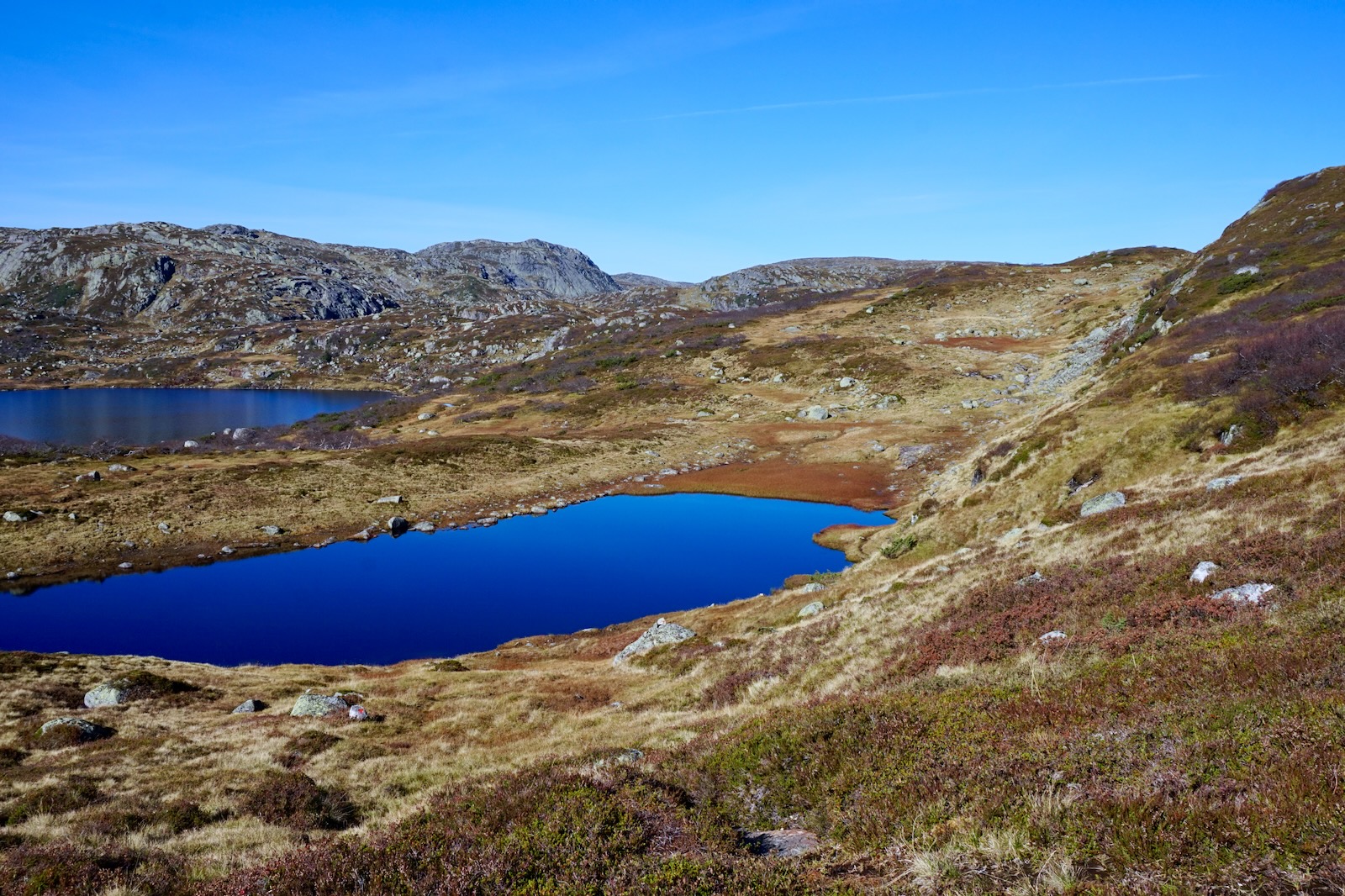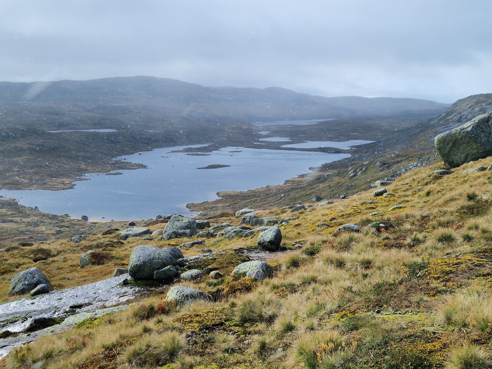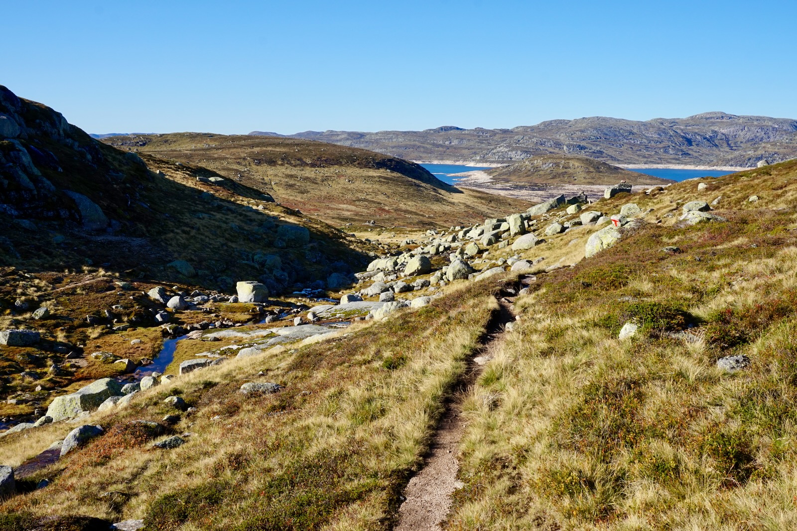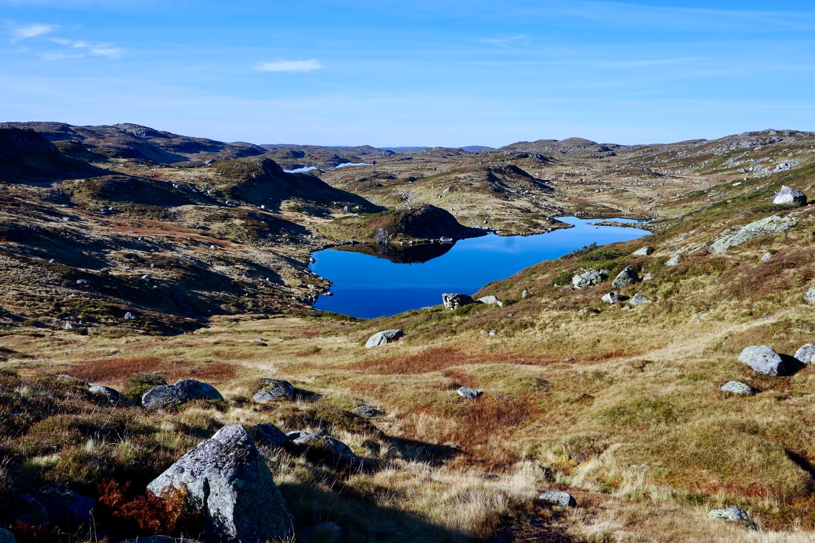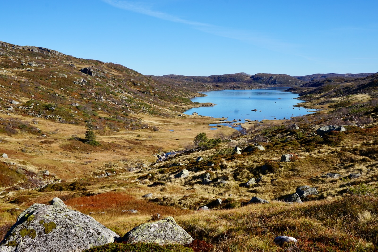 Med viss huvudvärk gav jag mig ändå i kast med stigningen upp från Valle och upp mot Dnt-hyttan Bossbu. Ifrån bilparkeringen skulle det vara ungefär sexhundra höjdmeter, så jag tog det i lugn takt. Här ser jag bakåt, efter någon timmes vandring. ![]() Uppåt. Närmare bestämt så hade jag startat ifrån bilparkeringen vid Berg, lite väster om Valle, och härifrån var det cirka femton kilometer att gå upp till Bossbu. ![]() Jag tvekar lite inför vad detta fjällområde kallas. Jag landade i att denna del nog kallas Setesdalsheiene (och det ligger också väster om Setesdalen, så det låter ju lite logiskt). Men området hänger ju också ihop med Ryfylkeheiene (som kanske är mer välkänt), och andra fjällområden, och i norr fortsätter det ju oavbrutet upp mot Hardangervidda. ![]() Ungefär halvvägs passerar man den obetjänta Dnt-hyttan Stavskar, där jag stannade för en paus. Det var en blåsig dag, så det var skönt att få komma in och få lite lä. Jag tog en bild på stugan men lyckades då få ett stort stenblock att effektivt skymma nästan hela. Den lilla stugan Stavskar ligger där bakom, hur som helst. ![]() Fortfarande uppåt. ![]() Någon kilometer efter Stavskar var man uppe på lite drygt 1200 meters höjd, som var dagens högsta punkt. Därefter blev landskapet västerut lite jämnare. ![]() ![]() ![]() Ganska flott landskap, och höstfärgerna gör ju sitt till. ![]() Längst bort syns sjön Botnsvatnet, vid vars hitersta ände Dnt-hytten Bossbu ligger. ![]() ![]() ![]() Framme vid Bossbu äntligen. I den mindre hytten till höger bodde en far och dotter ifrån Tyskland, och i stugan till vänster bodde jag den här natten, tillsammans med två trevliga karlar från Oslo som var på tur tvärs genom området. Deras mål var Lysebotn vid Lysefjorden, som de nådde någon vecka senare. ![]() Nyss inkommen i stugan. Bossbu byggdes för ett tiotal år sedan, och är väldigt funktionell. Och fin! ![]() Så fin! Värmen efter tidigare gäster hängde fortfarande kvar i stugan, som kändes väldigt välbyggd. ![]() Dagen efter, och jag kände faktiskt inte alls för att lämna stället. Jag ville sitta här i den sköna värmen från kaminen och titta ut på busvädret utanför hela dagen. Kanske somna lite i soffan. Mina nyfunna vänner från Oslo hade lämnat stugan tidigt på morgonen, de hade en lång vandringsdag framför sig. Det var så tyst i huset. Ibland rystade vinden i stugan så att knutarna knakade, men annars var det alldeles tyst. Efter en stund tycktes vädret bli lite bättre i alla fall... och jag kunde inte längre förtränga det faktum, att om jag skulle ha någon chans att hinna gå den sträcka jag tänkt, så hade jag inte råd med några vilodagar! Jag packade så småningom mina grejer långsamt, långsamt. ![]() ![]() Snön hade lagt sig på de högre bergen där borta under natten. ![]() Till slut lämnade jag Bossbu ändå. Det var fortfarande kyligt i luften, men det skulle komma att bli en fin dag! ![]() Jag var på väg söderut mot den självbetjänta DNT-hyttan Svartenut. Det var bara lite drygt en mil dit, skönt efter stigningen igår. ![]() Men fortfarande återkom ovädret då och då, snöflingor yrde i luften när jag kom över krönet mot Auguntjørnin. Jag gick utefter sjön under någon kilometer, på en ganska besvärlig stig. ![]() ![]() Fortsatte sedan att följa denna vackra dal mot sydväst ända fram till stugan. ![]() Svartenut, där jag tillbringade natten. Det hade varit jag och en tjej ifrån Nederländerna (och hennes hund) där. Hon var väldigt trevlig, och också lite eljest! ;) Hon tyckte om att gå barfota i fjällen, och när jag förmodligen verkade lite skeptisk så berättade hon att hon till och med varit uppe på Fannaråken barfota :o Respekt från min sida – även om jag kanske menade på att man behöver ju inte göra allting bara för att det går! :D ![]() Vilket underbart höstväder! :) ![]() Dessa bilder togs på morgonen, och det spritte i benen av förväntan! Vad skulle vandringen bjuda på denna fina dag? ![]() Ja, det första som skedde var ju att jag skulle försöka korsa den här älven på ett så torrskott sätt som möjligt... Det gick inget vidare. Skorna blev genomblöta, men jag kände att det inte spelade så stor roll – så länge som det inte blir kallt så stör det mig inte så mycket om skorna blir blöta. Och denna dag värmde solen ordentligt! :) ![]() Farväl, Svartenut. ![]() ![]() ![]() Wow. Utsikten över Roskreppfjorden var fantastisk. ![]() När jag ser på dessa bilder nu i efterhand kommer jag också att tänka på boken "Hundra år av ensamhet" som jag började lyssna på den här dagen, och därefter sträcklyssnade på till slutet! En speciell bok, minst sagt. ![]() Otroligt fint. Och så ensam jag var – jag mötte ingen alls på stigarna under de sista tre dagarna. ![]() ![]() Stigen gick upp och ned i maklig takt, det var sällan stora höjdskillnader. ![]() På det stora hela var det väldigt lättvandrat. ![]() Porlande bäckar och varierad grönska gjorde mig glad! ![]() Jag följde Dnt-stigen rakt söderut mot hyttan Øyuvsbu, en vandring på cirka femton kilometer. ![]() ![]() Inte ett moln på himlen. Det är såna här höstvandringar man drömmer om! ![]() ![]() ![]() Väldigt frodigt landskap. Här är jag någonstans i närheten av Kleivi, på lite drygt tusen meters höjd – och det växte ett litet bestånd med granar mitt bland enbuskarna! Man blir ju fundersam. Undrar hur det kommer att se ut här om hundra år? Kommer hela detta område att bestå av tät granskog? ![]() ![]() Här ser jag rakt österut ner i Evardalen. Även om det känns som att jag är långt ute i vildmarken så är det bara fem kilometer ner till en bilparkering åt det hållet. ![]() Här har jag klarat av en av dagens högsta stigningar (som ändå inte var mer än 150 meter), och fick lite utsikt mot det kargare landskapet i väster. ![]() ![]() ![]()