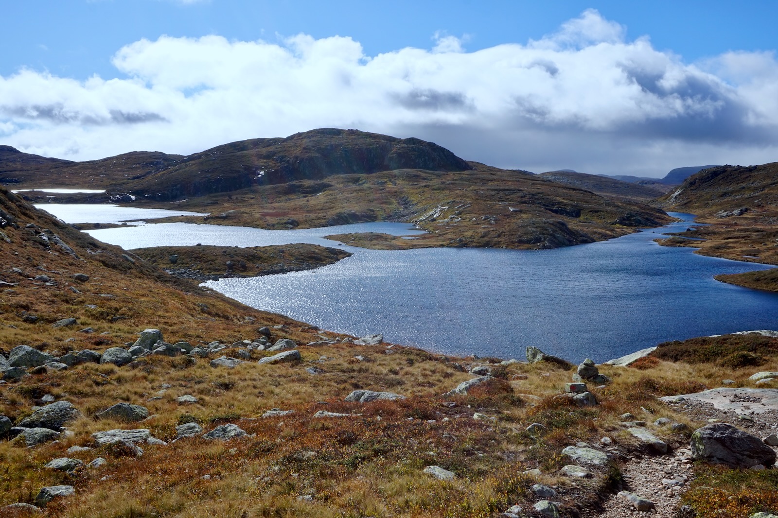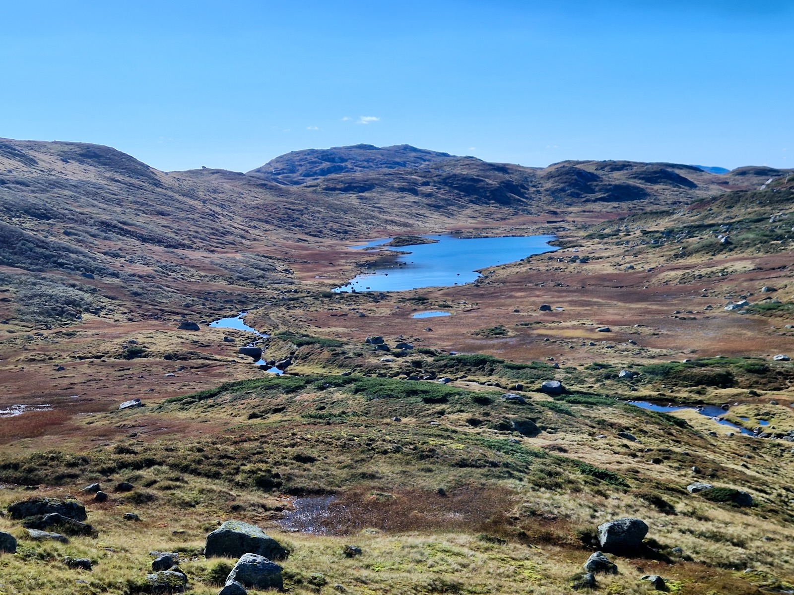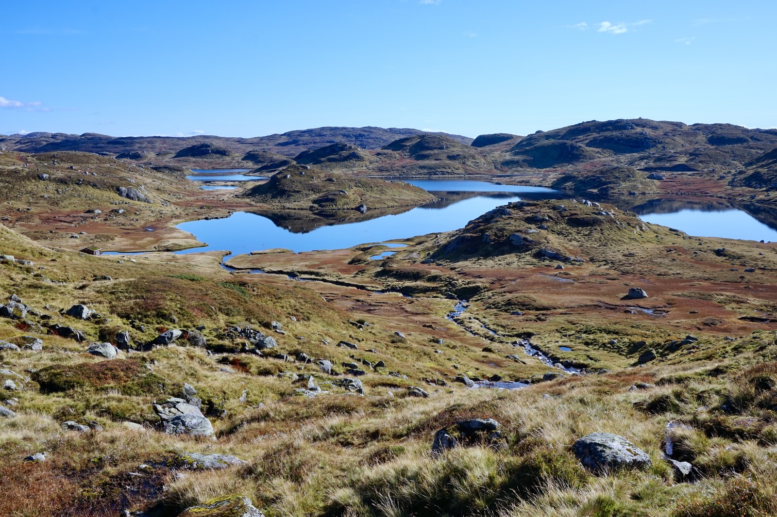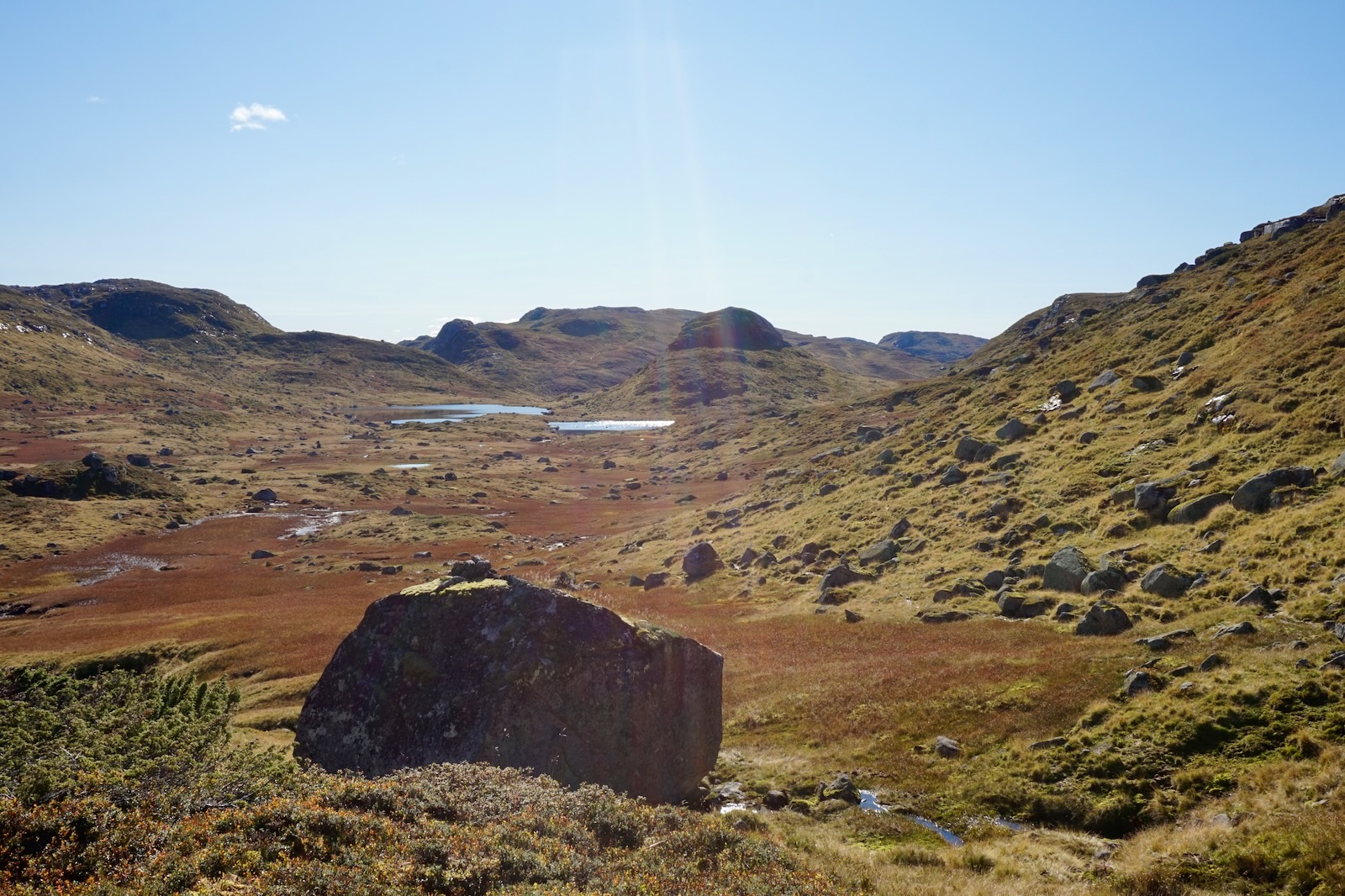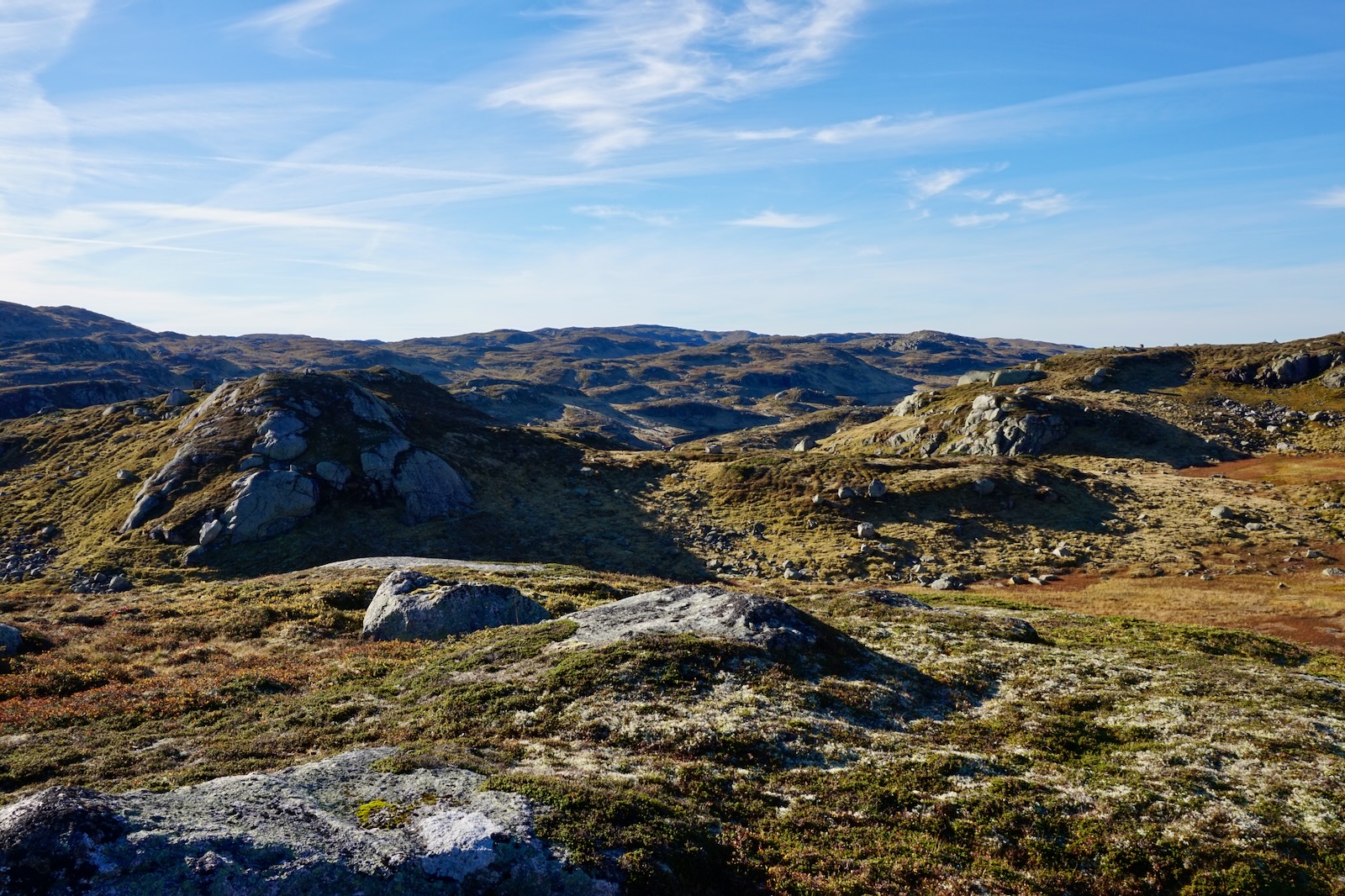 Med viss huvudvärk gav jag mig ändå i kast med stigningen upp från Valle och upp mot Dnt-hyttan Bossbu. Ifrån bilparkeringen skulle det vara ungefär sexhundra höjdmeter, så jag tog det i lugn takt. Här ser jag bakåt, efter någon timmes vandring. ![]() Uppåt. Närmare bestämt så hade jag startat ifrån bilparkeringen vid Berg, lite väster om Valle, och härifrån var det cirka femton kilometer att gå upp till Bossbu. ![]() Jag tvekar lite inför vad detta fjällområde kallas. Jag landade i att denna del nog kallas Setesdalsheiene (och det ligger också väster om Setesdalen, så det låter ju lite logiskt). Men området hänger ju också ihop med Ryfylkeheiene (som kanske är mer välkänt), och andra fjällområden, och i norr fortsätter det ju oavbrutet upp mot Hardangervidda. ![]() Ungefär halvvägs passerar man den obetjänta Dnt-hyttan Stavskar, där jag stannade för en paus. Det var en blåsig dag, så det var skönt att få komma in och få lite lä. Jag tog en bild på stugan men lyckades då få ett stort stenblock att effektivt skymma nästan hela. Den lilla stugan Stavskar ligger där bakom, hur som helst. ![]() Fortfarande uppåt. ![]() Någon kilometer efter Stavskar var man uppe på lite drygt 1200 meters höjd, som var dagens högsta punkt. Därefter blev landskapet västerut lite jämnare. ![]() ![]() ![]() Ganska flott landskap, och höstfärgerna gör ju sitt till. ![]() Längst bort syns sjön Botnsvatnet, vid vars hitersta ände Dnt-hytten Bossbu ligger. ![]() ![]() ![]() Framme vid Bossbu äntligen. I den mindre hytten till höger bodde en far och dotter ifrån Tyskland, och i stugan till vänster bodde jag den här natten, tillsammans med två trevliga karlar från Oslo som var på tur tvärs genom området. Deras mål var Lysebotn vid Lysefjorden, som de nådde någon vecka senare. ![]() Nyss inkommen i stugan. Bossbu byggdes för ett tiotal år sedan, och är väldigt funktionell. Och fin! ![]() Så fin! Värmen efter tidigare gäster hängde fortfarande kvar i stugan, som kändes väldigt välbyggd. ![]() Dagen efter, och jag kände faktiskt inte alls för att lämna stället. Jag ville sitta här i den sköna värmen från kaminen och titta ut på busvädret utanför hela dagen. Kanske somna lite i soffan. Mina nyfunna vänner från Oslo hade lämnat stugan tidigt på morgonen, de hade en lång vandringsdag framför sig. Det var så tyst i huset. Ibland rystade vinden i stugan så att knutarna knakade, men annars var det alldeles tyst. Efter en stund tycktes vädret bli lite bättre i alla fall... och jag kunde inte längre förtränga det faktum, att om jag skulle ha någon chans att hinna gå den sträcka jag tänkt, så hade jag inte råd med några vilodagar! Jag packade så småningom mina grejer långsamt, långsamt. ![]() ![]() Snön hade lagt sig på de högre bergen där borta under natten. ![]() Till slut lämnade jag Bossbu ändå. Det var fortfarande kyligt i luften, men det skulle komma att bli en fin dag! ![]() Jag var på väg söderut mot den självbetjänta DNT-hyttan Svartenut. Det var bara lite drygt en mil dit, skönt efter stigningen igår. ![]() Men fortfarande återkom ovädret då och då, snöflingor yrde i luften när jag kom över krönet mot Auguntjørnin. Jag gick utefter sjön under någon kilometer, på en ganska besvärlig stig. ![]() ![]() Fortsatte sedan att följa denna vackra dal mot sydväst ända fram till stugan. ![]() Svartenut, där jag tillbringade natten. Det hade varit jag och en tjej ifrån Nederländerna (och hennes hund) där. Hon var väldigt trevlig, och också lite eljest! ;) Hon tyckte om att gå barfota i fjällen, och när jag förmodligen verkade lite skeptisk så berättade hon att hon till och med varit uppe på Fannaråken barfota :o Respekt från min sida – även om jag kanske menade på att man behöver ju inte göra allting bara för att det går! :D ![]() Vilket underbart höstväder! :) ![]() Dessa bilder togs på morgonen, och det spritte i benen av förväntan! Vad skulle vandringen bjuda på denna fina dag? ![]() Ja, det första som skedde var ju att jag skulle försöka korsa den här älven på ett så torrskott sätt som möjligt... Det gick inget vidare. Skorna blev genomblöta, men jag kände att det inte spelade så stor roll – så länge som det inte blir kallt så stör det mig inte så mycket om skorna blir blöta. Och denna dag värmde solen ordentligt! :) ![]() Farväl, Svartenut. ![]() ![]() ![]() Wow. Utsikten över Roskreppfjorden var fantastisk. ![]() När jag ser på dessa bilder nu i efterhand kommer jag också att tänka på boken "Hundra år av ensamhet" som jag började lyssna på den här dagen, och därefter sträcklyssnade på till slutet! En speciell bok, minst sagt. ![]() Otroligt fint. Och så ensam jag var – jag mötte ingen alls på stigarna under de sista tre dagarna. ![]() ![]() Stigen gick upp och ned i maklig takt, det var sällan stora höjdskillnader. ![]() På det stora hela var det väldigt lättvandrat. ![]() Porlande bäckar och varierad grönska gjorde mig glad! ![]() Jag följde Dnt-stigen rakt söderut mot hyttan Øyuvsbu, en vandring på cirka femton kilometer. ![]() ![]() Inte ett moln på himlen. Det är såna här höstvandringar man drömmer om! ![]() ![]() ![]() Väldigt frodigt landskap. Här är jag någonstans i närheten av Kleivi, på lite drygt tusen meters höjd – och det växte ett litet bestånd med granar mitt bland enbuskarna! Man blir ju fundersam. Undrar hur det kommer att se ut här om hundra år? Kommer hela detta område att bestå av tät granskog? ![]() ![]() Här ser jag rakt österut ner i Evardalen. Även om det känns som att jag är långt ute i vildmarken så är det bara fem kilometer ner till en bilparkering åt det hållet. ![]() Här har jag klarat av en av dagens högsta stigningar (som ändå inte var mer än 150 meter), och fick lite utsikt mot det kargare landskapet i väster. ![]() ![]() ![]()