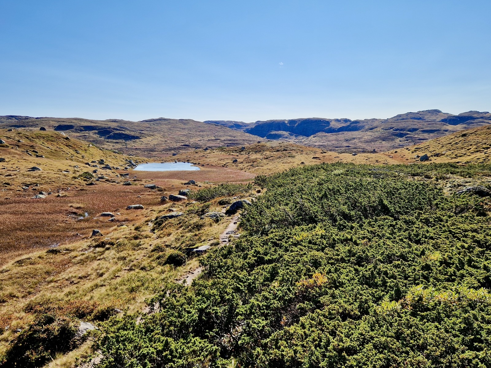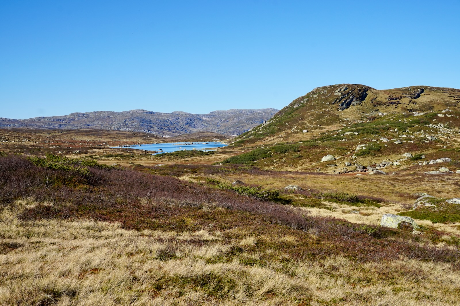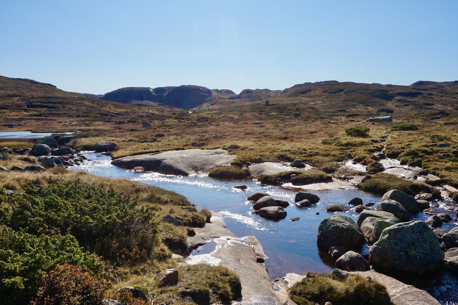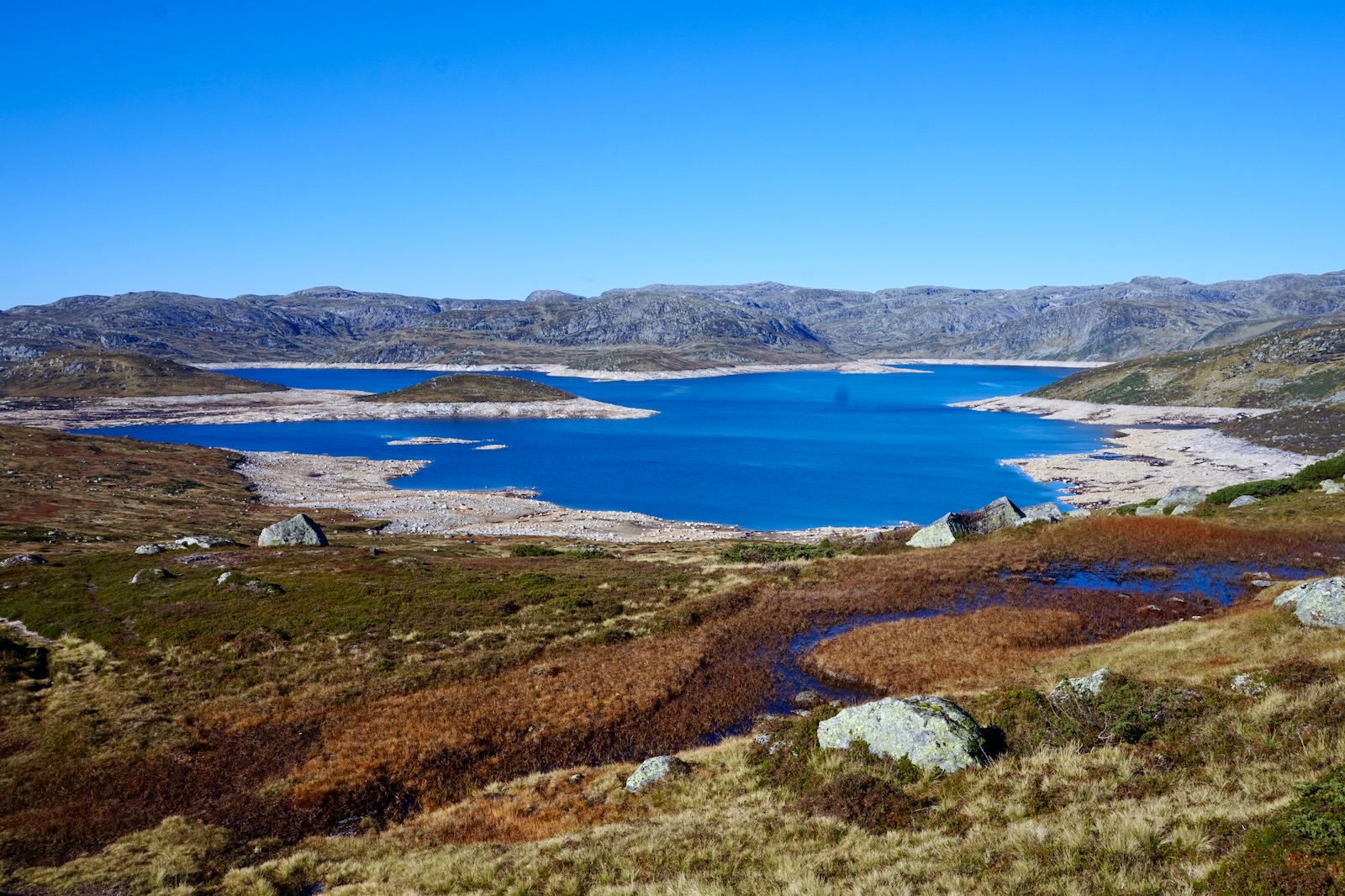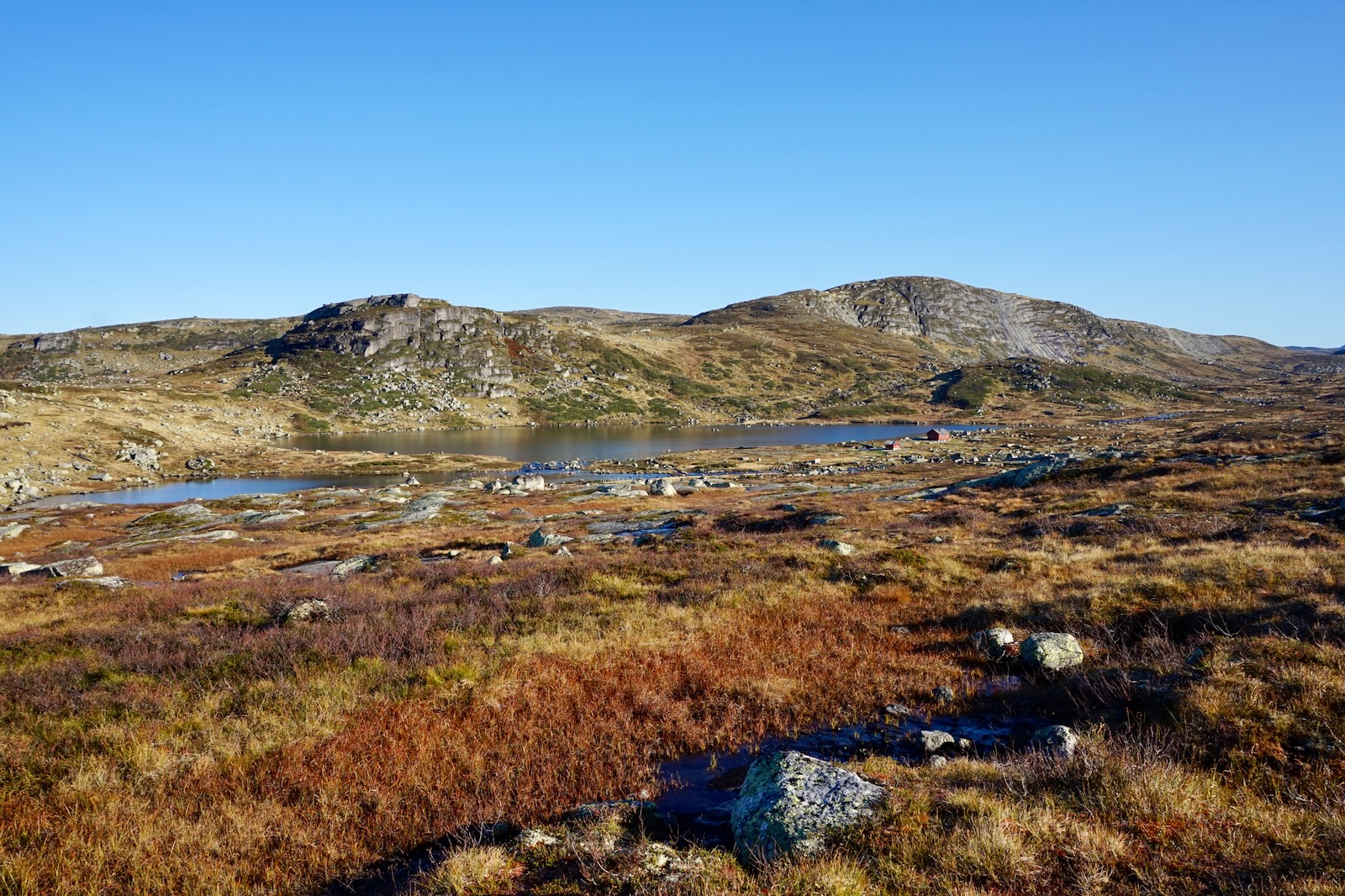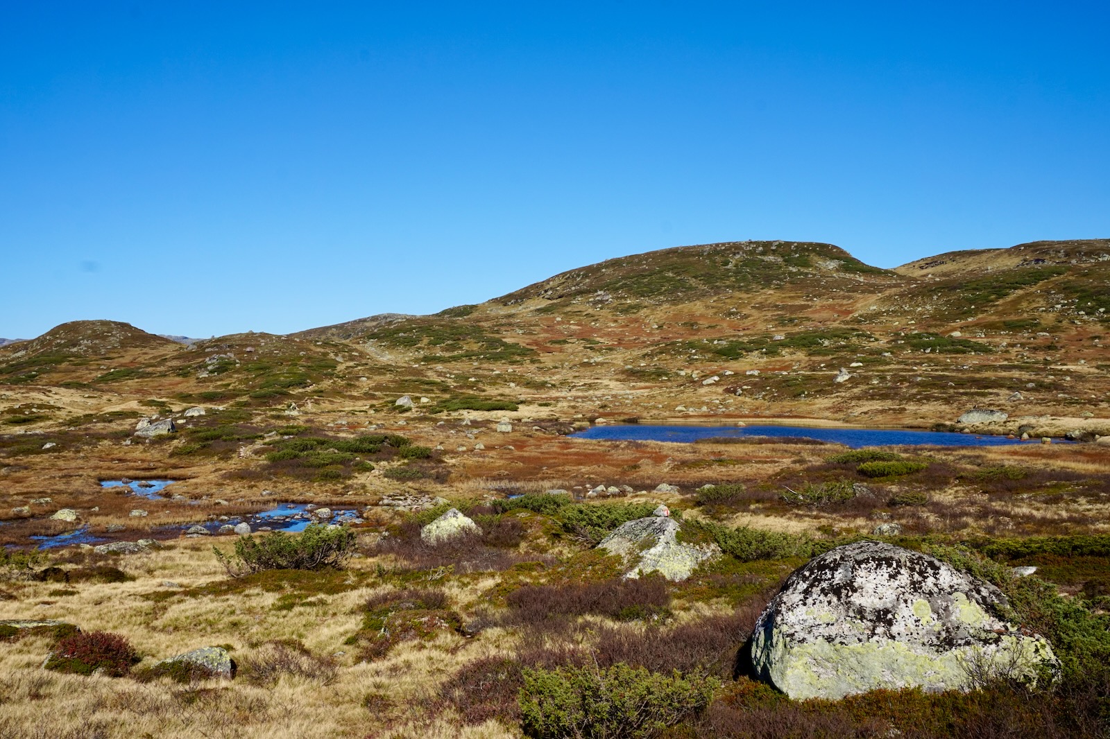 Med viss huvudvärk gav jag mig ändå i kast med stigningen upp från Valle och upp mot Dnt-hyttan Bossbu. Ifrån bilparkeringen skulle det vara ungefär sexhundra höjdmeter, så jag tog det i lugn takt. Här ser jag bakåt, efter någon timmes vandring. ![]() Uppåt. Närmare bestämt så hade jag startat ifrån bilparkeringen vid Berg, lite väster om Valle, och härifrån var det cirka femton kilometer att gå upp till Bossbu. ![]() Jag tvekar lite inför vad detta fjällområde kallas. Jag landade i att denna del nog kallas Setesdalsheiene (och det ligger också väster om Setesdalen, så det låter ju lite logiskt). Men området hänger ju också ihop med Ryfylkeheiene (som kanske är mer välkänt), och andra fjällområden, och i norr fortsätter det ju oavbrutet upp mot Hardangervidda. ![]() Ungefär halvvägs passerar man den obetjänta Dnt-hyttan Stavskar, där jag stannade för en paus. Det var en blåsig dag, så det var skönt att få komma in och få lite lä. Jag tog en bild på stugan men lyckades då få ett stort stenblock att effektivt skymma nästan hela. Den lilla stugan Stavskar ligger där bakom, hur som helst. ![]() Fortfarande uppåt. ![]() Någon kilometer efter Stavskar var man uppe på lite drygt 1200 meters höjd, som var dagens högsta punkt. Därefter blev landskapet västerut lite jämnare. ![]() ![]() ![]() Ganska flott landskap, och höstfärgerna gör ju sitt till. ![]() Längst bort syns sjön Botnsvatnet, vid vars hitersta ände Dnt-hytten Bossbu ligger. ![]() ![]() ![]() Framme vid Bossbu äntligen. I den mindre hytten till höger bodde en far och dotter ifrån Tyskland, och i stugan till vänster bodde jag den här natten, tillsammans med två trevliga karlar från Oslo som var på tur tvärs genom området. Deras mål var Lysebotn vid Lysefjorden, som de nådde någon vecka senare. ![]() Nyss inkommen i stugan. Bossbu byggdes för ett tiotal år sedan, och är väldigt funktionell. Och fin! ![]() Så fin! Värmen efter tidigare gäster hängde fortfarande kvar i stugan, som kändes väldigt välbyggd. ![]() Dagen efter, och jag kände faktiskt inte alls för att lämna stället. Jag ville sitta här i den sköna värmen från kaminen och titta ut på busvädret utanför hela dagen. Kanske somna lite i soffan. Mina nyfunna vänner från Oslo hade lämnat stugan tidigt på morgonen, de hade en lång vandringsdag framför sig. Det var så tyst i huset. Ibland rystade vinden i stugan så att knutarna knakade, men annars var det alldeles tyst. Efter en stund tycktes vädret bli lite bättre i alla fall... och jag kunde inte längre förtränga det faktum, att om jag skulle ha någon chans att hinna gå den sträcka jag tänkt, så hade jag inte råd med några vilodagar! Jag packade så småningom mina grejer långsamt, långsamt. ![]() ![]() Snön hade lagt sig på de högre bergen där borta under natten. ![]() Till slut lämnade jag Bossbu ändå. Det var fortfarande kyligt i luften, men det skulle komma att bli en fin dag! ![]() Jag var på väg söderut mot den självbetjänta DNT-hyttan Svartenut. Det var bara lite drygt en mil dit, skönt efter stigningen igår. ![]() Men fortfarande återkom ovädret då och då, snöflingor yrde i luften när jag kom över krönet mot Auguntjørnin. Jag gick utefter sjön under någon kilometer, på en ganska besvärlig stig. ![]() ![]() Fortsatte sedan att följa denna vackra dal mot sydväst ända fram till stugan. ![]() Svartenut, där jag tillbringade natten. Det hade varit jag och en tjej ifrån Nederländerna (och hennes hund) där. Hon var väldigt trevlig, och också lite eljest! ;) Hon tyckte om att gå barfota i fjällen, och när jag förmodligen verkade lite skeptisk så berättade hon att hon till och med varit uppe på Fannaråken barfota :o Respekt från min sida – även om jag kanske menade på att man behöver ju inte göra allting bara för att det går! :D ![]() Vilket underbart höstväder! :) ![]() Dessa bilder togs på morgonen, och det spritte i benen av förväntan! Vad skulle vandringen bjuda på denna fina dag? ![]() Ja, det första som skedde var ju att jag skulle försöka korsa den här älven på ett så torrskott sätt som möjligt... Det gick inget vidare. Skorna blev genomblöta, men jag kände att det inte spelade så stor roll – så länge som det inte blir kallt så stör det mig inte så mycket om skorna blir blöta. Och denna dag värmde solen ordentligt! :) ![]() Farväl, Svartenut. ![]() ![]() ![]() Wow. Utsikten över Roskreppfjorden var fantastisk. ![]() När jag ser på dessa bilder nu i efterhand kommer jag också att tänka på boken "Hundra år av ensamhet" som jag började lyssna på den här dagen, och därefter sträcklyssnade på till slutet! En speciell bok, minst sagt. ![]() Otroligt fint. Och så ensam jag var – jag mötte ingen alls på stigarna under de sista tre dagarna. ![]() ![]() Stigen gick upp och ned i maklig takt, det var sällan stora höjdskillnader. ![]() På det stora hela var det väldigt lättvandrat. ![]() Porlande bäckar och varierad grönska gjorde mig glad! ![]() Jag följde Dnt-stigen rakt söderut mot hyttan Øyuvsbu, en vandring på cirka femton kilometer. ![]() ![]() Inte ett moln på himlen. Det är såna här höstvandringar man drömmer om! ![]() ![]() ![]() Väldigt frodigt landskap. Här är jag någonstans i närheten av Kleivi, på lite drygt tusen meters höjd – och det växte ett litet bestånd med granar mitt bland enbuskarna! Man blir ju fundersam. Undrar hur det kommer att se ut här om hundra år? Kommer hela detta område att bestå av tät granskog? ![]() ![]() Här ser jag rakt österut ner i Evardalen. Även om det känns som att jag är långt ute i vildmarken så är det bara fem kilometer ner till en bilparkering åt det hållet. ![]() Här har jag klarat av en av dagens högsta stigningar (som ändå inte var mer än 150 meter), och fick lite utsikt mot det kargare landskapet i väster. ![]() ![]() ![]()