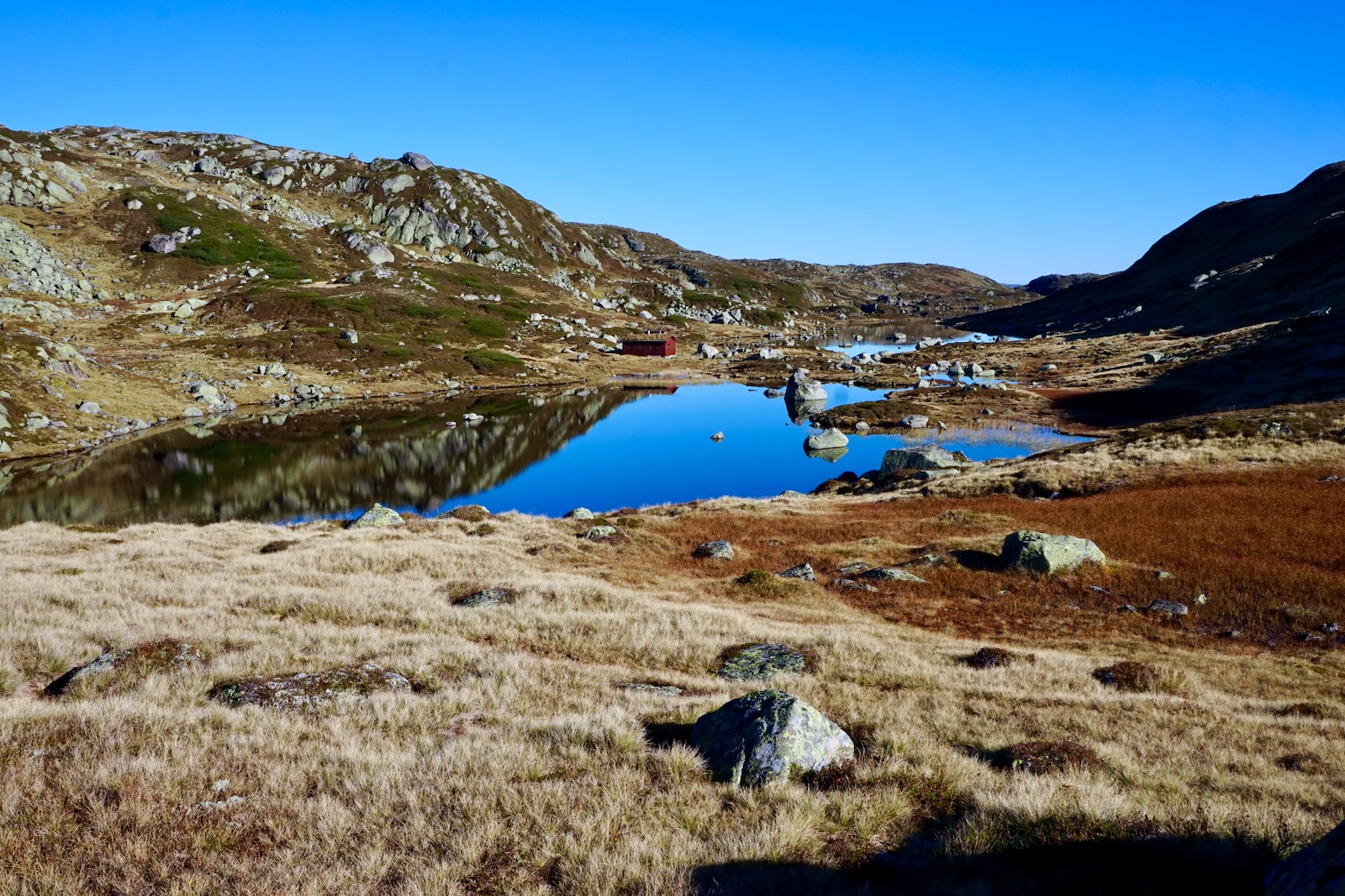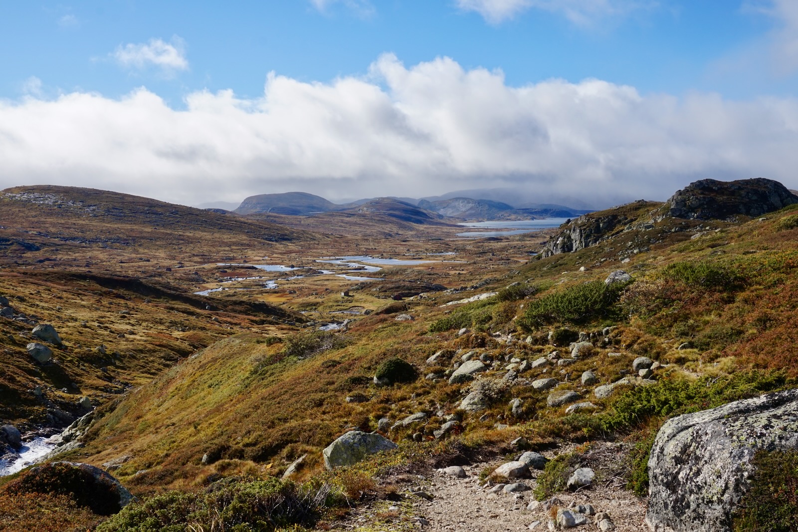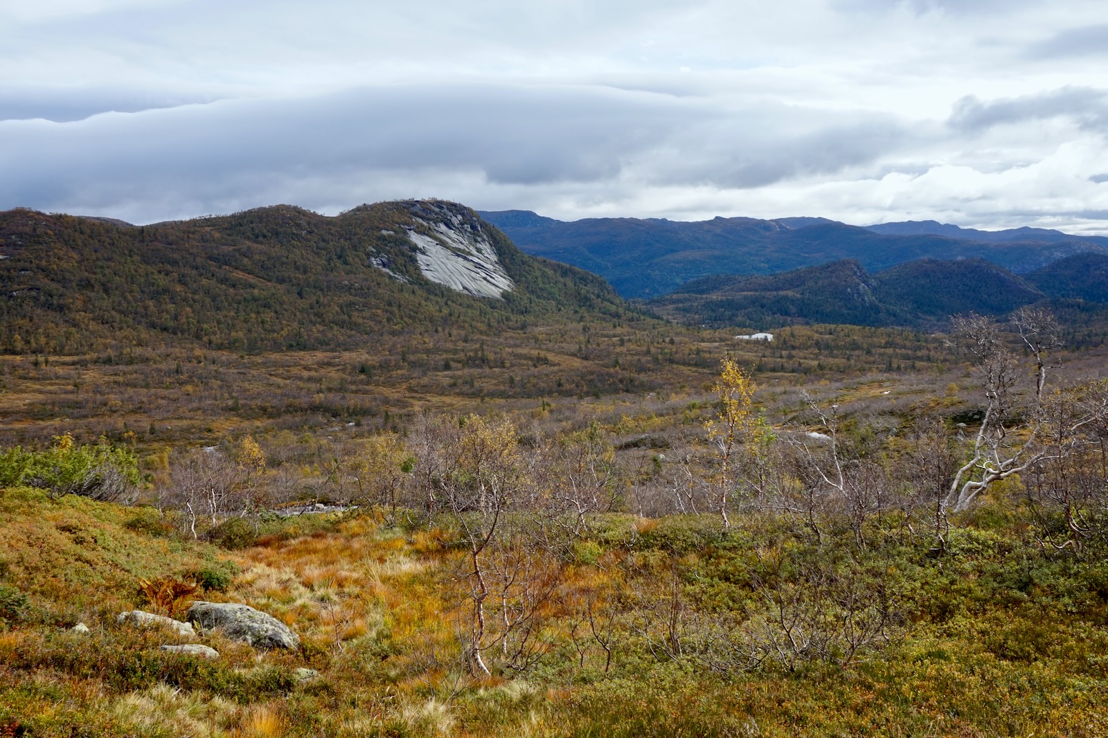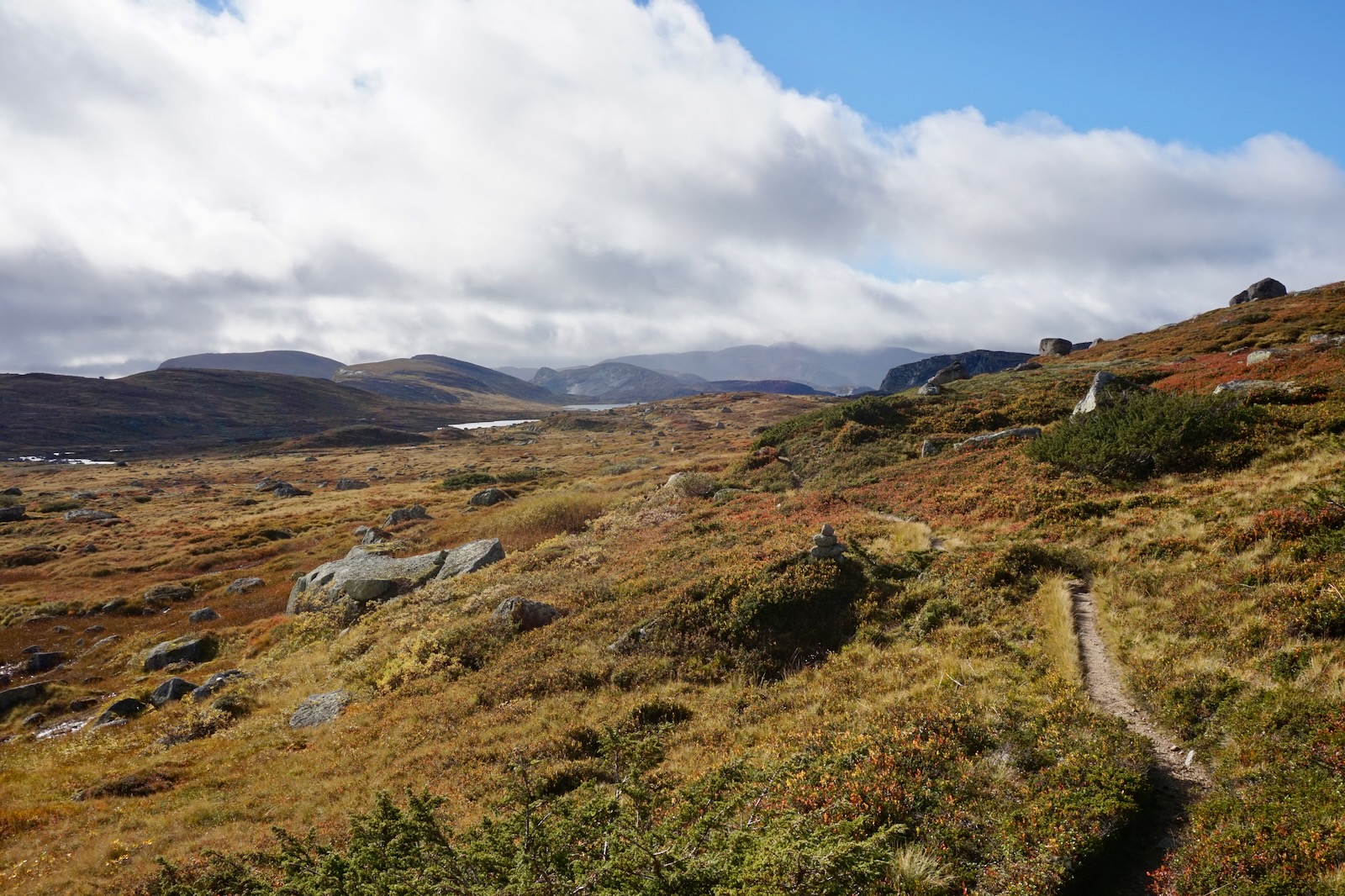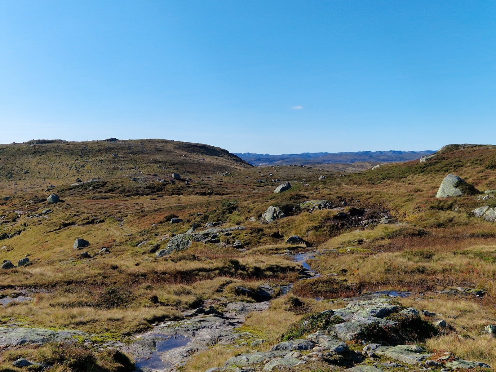 Med viss huvudvärk gav jag mig ändå i kast med stigningen upp från Valle och upp mot Dnt-hyttan Bossbu. Ifrån bilparkeringen skulle det vara ungefär sexhundra höjdmeter, så jag tog det i lugn takt. Här ser jag bakåt, efter någon timmes vandring. ![]() Uppåt. Närmare bestämt så hade jag startat ifrån bilparkeringen vid Berg, lite väster om Valle, och härifrån var det cirka femton kilometer att gå upp till Bossbu. ![]() Jag tvekar lite inför vad detta fjällområde kallas. Jag landade i att denna del nog kallas Setesdalsheiene (och det ligger också väster om Setesdalen, så det låter ju lite logiskt). Men området hänger ju också ihop med Ryfylkeheiene (som kanske är mer välkänt), och andra fjällområden, och i norr fortsätter det ju oavbrutet upp mot Hardangervidda. ![]() Ungefär halvvägs passerar man den obetjänta Dnt-hyttan Stavskar, där jag stannade för en paus. Det var en blåsig dag, så det var skönt att få komma in och få lite lä. Jag tog en bild på stugan men lyckades då få ett stort stenblock att effektivt skymma nästan hela. Den lilla stugan Stavskar ligger där bakom, hur som helst. ![]() Fortfarande uppåt. ![]() Någon kilometer efter Stavskar var man uppe på lite drygt 1200 meters höjd, som var dagens högsta punkt. Därefter blev landskapet västerut lite jämnare. ![]() ![]() ![]() Ganska flott landskap, och höstfärgerna gör ju sitt till. ![]() Längst bort syns sjön Botnsvatnet, vid vars hitersta ände Dnt-hytten Bossbu ligger. ![]() ![]() ![]() Framme vid Bossbu äntligen. I den mindre hytten till höger bodde en far och dotter ifrån Tyskland, och i stugan till vänster bodde jag den här natten, tillsammans med två trevliga karlar från Oslo som var på tur tvärs genom området. Deras mål var Lysebotn vid Lysefjorden, som de nådde någon vecka senare. ![]() Nyss inkommen i stugan. Bossbu byggdes för ett tiotal år sedan, och är väldigt funktionell. Och fin! ![]() Så fin! Värmen efter tidigare gäster hängde fortfarande kvar i stugan, som kändes väldigt välbyggd. ![]() Dagen efter, och jag kände faktiskt inte alls för att lämna stället. Jag ville sitta här i den sköna värmen från kaminen och titta ut på busvädret utanför hela dagen. Kanske somna lite i soffan. Mina nyfunna vänner från Oslo hade lämnat stugan tidigt på morgonen, de hade en lång vandringsdag framför sig. Det var så tyst i huset. Ibland rystade vinden i stugan så att knutarna knakade, men annars var det alldeles tyst. Efter en stund tycktes vädret bli lite bättre i alla fall... och jag kunde inte längre förtränga det faktum, att om jag skulle ha någon chans att hinna gå den sträcka jag tänkt, så hade jag inte råd med några vilodagar! Jag packade så småningom mina grejer långsamt, långsamt. ![]() ![]() Snön hade lagt sig på de högre bergen där borta under natten. ![]() Till slut lämnade jag Bossbu ändå. Det var fortfarande kyligt i luften, men det skulle komma att bli en fin dag! ![]() Jag var på väg söderut mot den självbetjänta DNT-hyttan Svartenut. Det var bara lite drygt en mil dit, skönt efter stigningen igår. ![]() Men fortfarande återkom ovädret då och då, snöflingor yrde i luften när jag kom över krönet mot Auguntjørnin. Jag gick utefter sjön under någon kilometer, på en ganska besvärlig stig. ![]() ![]() Fortsatte sedan att följa denna vackra dal mot sydväst ända fram till stugan. ![]() Svartenut, där jag tillbringade natten. Det hade varit jag och en tjej ifrån Nederländerna (och hennes hund) där. Hon var väldigt trevlig, och också lite eljest! ;) Hon tyckte om att gå barfota i fjällen, och när jag förmodligen verkade lite skeptisk så berättade hon att hon till och med varit uppe på Fannaråken barfota :o Respekt från min sida – även om jag kanske menade på att man behöver ju inte göra allting bara för att det går! :D ![]() Vilket underbart höstväder! :) ![]() Dessa bilder togs på morgonen, och det spritte i benen av förväntan! Vad skulle vandringen bjuda på denna fina dag? ![]() Ja, det första som skedde var ju att jag skulle försöka korsa den här älven på ett så torrskott sätt som möjligt... Det gick inget vidare. Skorna blev genomblöta, men jag kände att det inte spelade så stor roll – så länge som det inte blir kallt så stör det mig inte så mycket om skorna blir blöta. Och denna dag värmde solen ordentligt! :) ![]() Farväl, Svartenut. ![]() ![]() ![]() Wow. Utsikten över Roskreppfjorden var fantastisk. ![]() När jag ser på dessa bilder nu i efterhand kommer jag också att tänka på boken "Hundra år av ensamhet" som jag började lyssna på den här dagen, och därefter sträcklyssnade på till slutet! En speciell bok, minst sagt. ![]() Otroligt fint. Och så ensam jag var – jag mötte ingen alls på stigarna under de sista tre dagarna. ![]() ![]() Stigen gick upp och ned i maklig takt, det var sällan stora höjdskillnader. ![]() På det stora hela var det väldigt lättvandrat. ![]() Porlande bäckar och varierad grönska gjorde mig glad! ![]() Jag följde Dnt-stigen rakt söderut mot hyttan Øyuvsbu, en vandring på cirka femton kilometer. ![]() ![]() Inte ett moln på himlen. Det är såna här höstvandringar man drömmer om! ![]() ![]() ![]() Väldigt frodigt landskap. Här är jag någonstans i närheten av Kleivi, på lite drygt tusen meters höjd – och det växte ett litet bestånd med granar mitt bland enbuskarna! Man blir ju fundersam. Undrar hur det kommer att se ut här om hundra år? Kommer hela detta område att bestå av tät granskog? ![]() ![]() Här ser jag rakt österut ner i Evardalen. Även om det känns som att jag är långt ute i vildmarken så är det bara fem kilometer ner till en bilparkering åt det hållet. ![]() Här har jag klarat av en av dagens högsta stigningar (som ändå inte var mer än 150 meter), och fick lite utsikt mot det kargare landskapet i väster. ![]() ![]() ![]()