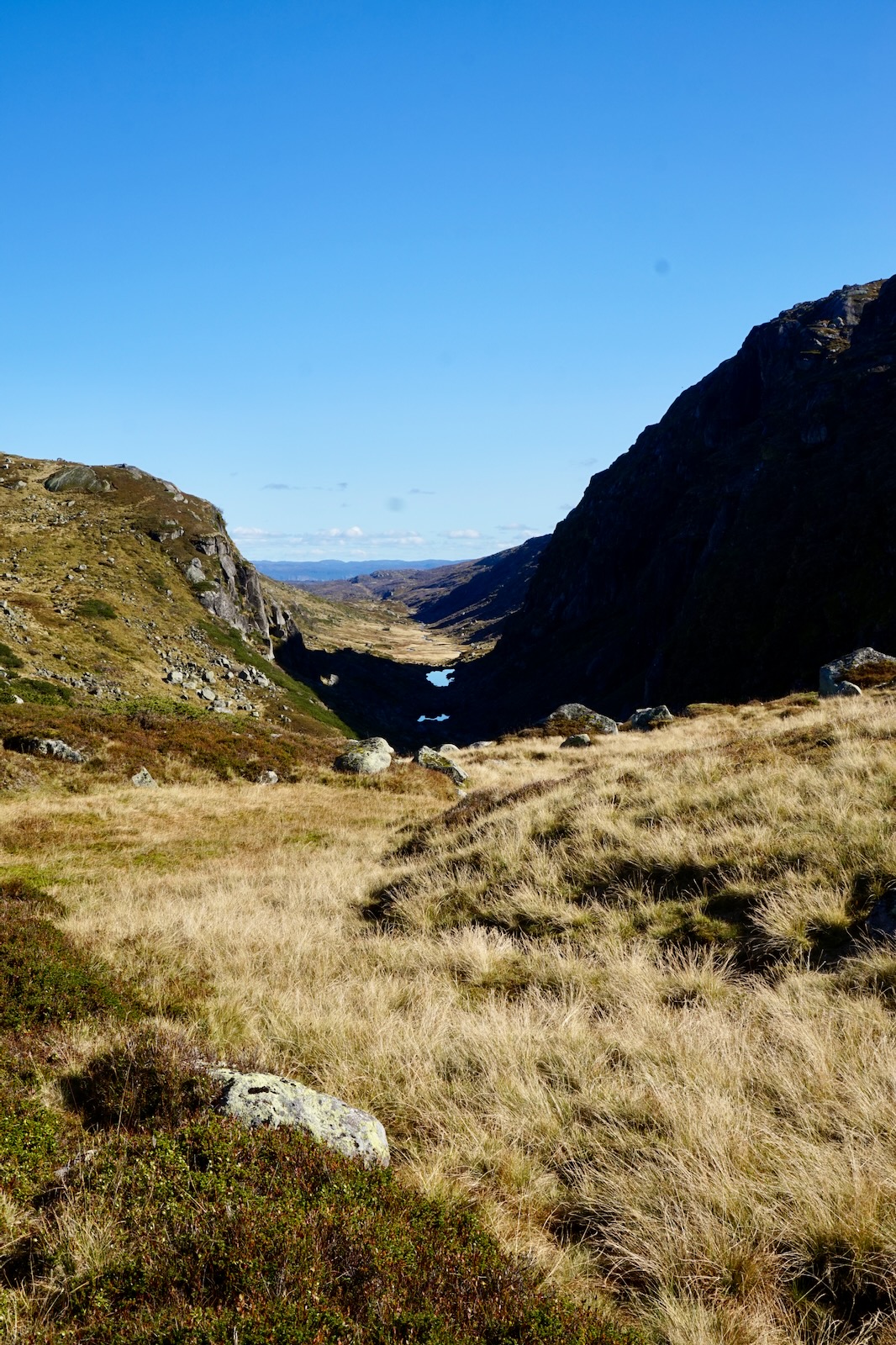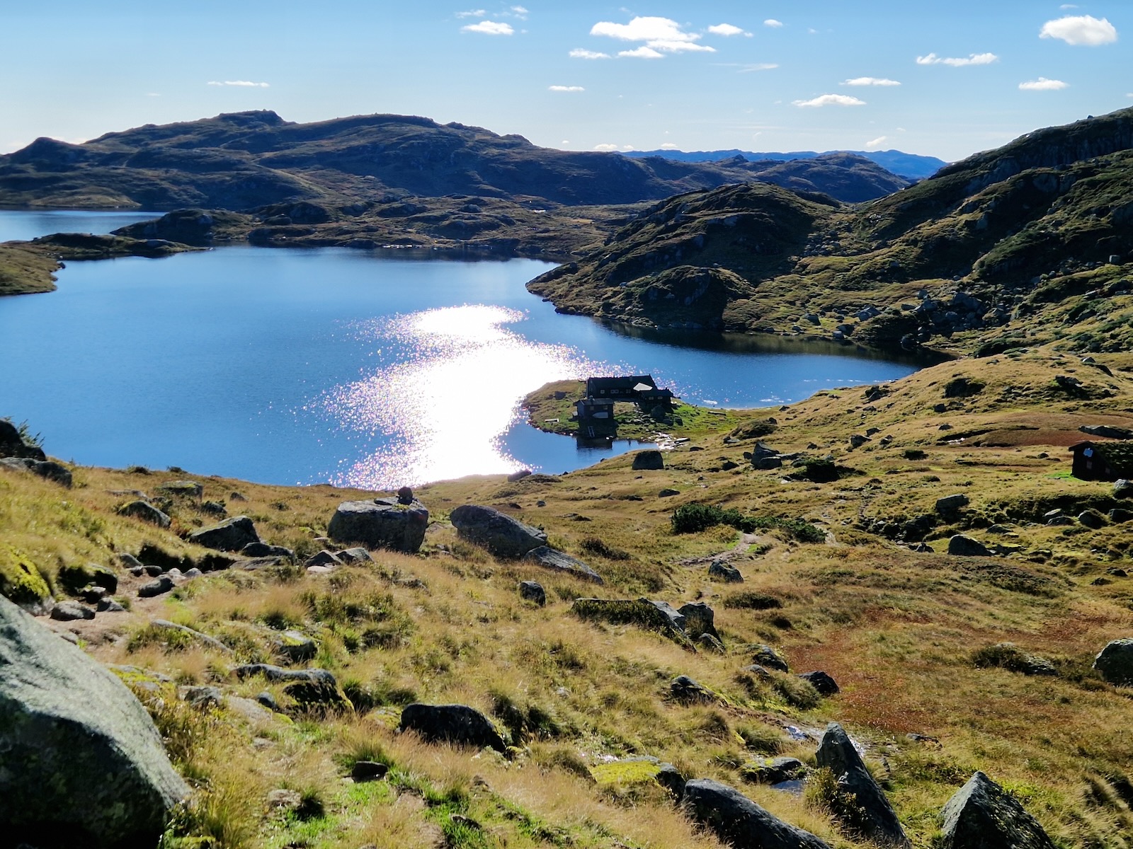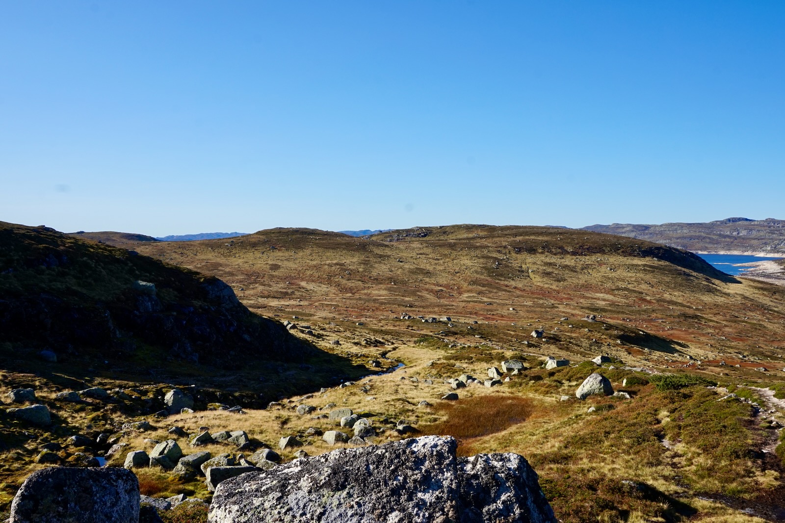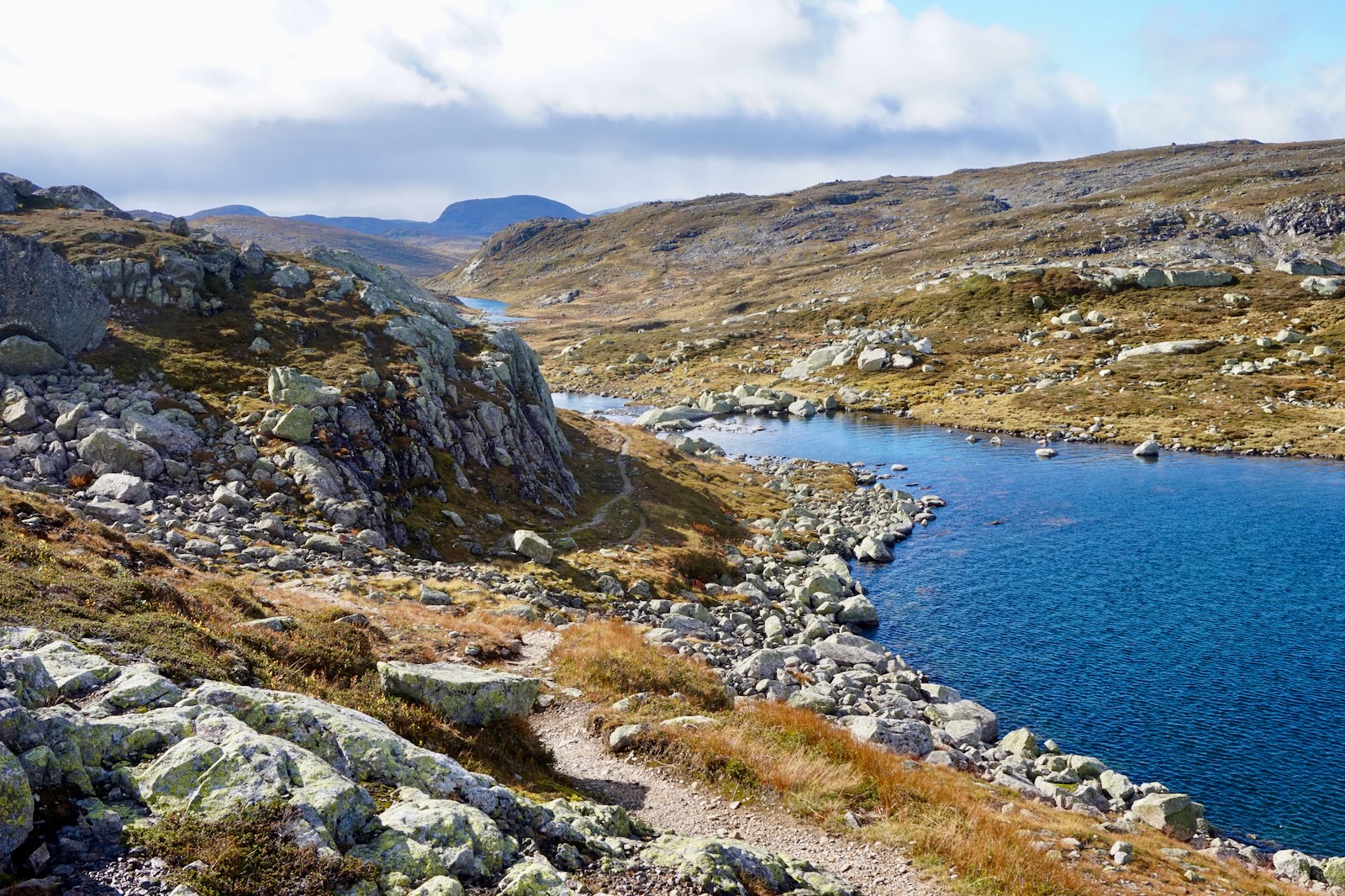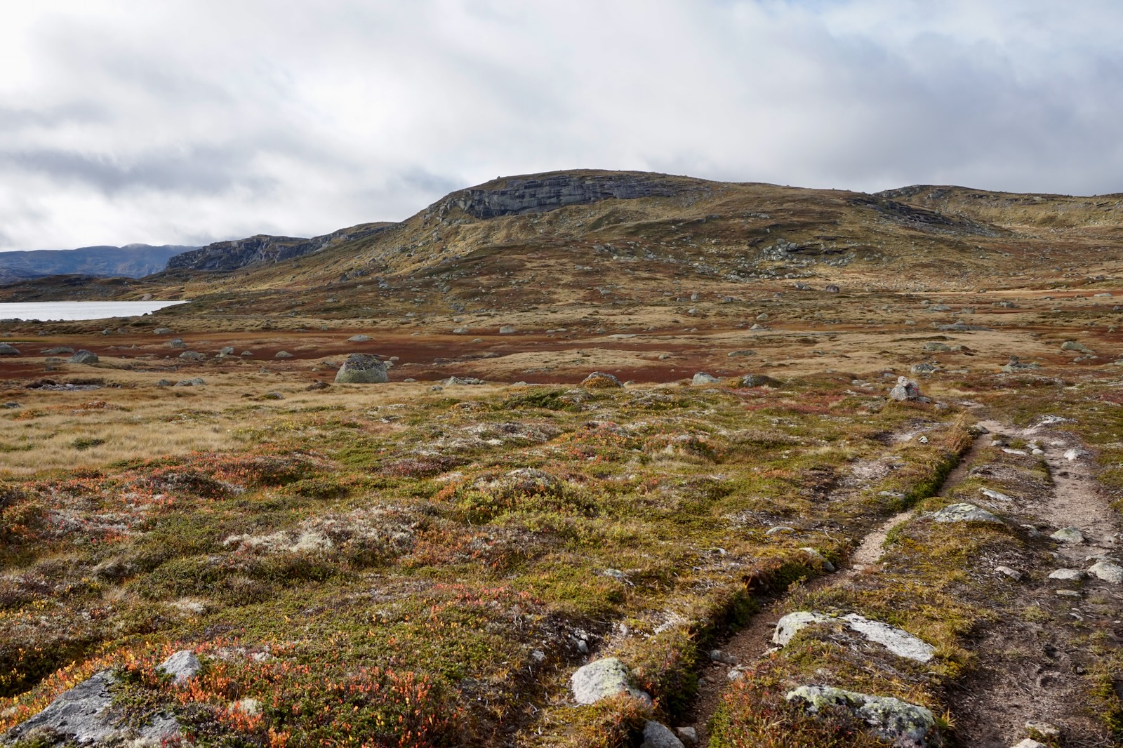 Med viss huvudvärk gav jag mig ändå i kast med stigningen upp från Valle och upp mot Dnt-hyttan Bossbu. Ifrån bilparkeringen skulle det vara ungefär sexhundra höjdmeter, så jag tog det i lugn takt. Här ser jag bakåt, efter någon timmes vandring. ![]() Uppåt. Närmare bestämt så hade jag startat ifrån bilparkeringen vid Berg, lite väster om Valle, och härifrån var det cirka femton kilometer att gå upp till Bossbu. ![]() Jag tvekar lite inför vad detta fjällområde kallas. Jag landade i att denna del nog kallas Setesdalsheiene (och det ligger också väster om Setesdalen, så det låter ju lite logiskt). Men området hänger ju också ihop med Ryfylkeheiene (som kanske är mer välkänt), och andra fjällområden, och i norr fortsätter det ju oavbrutet upp mot Hardangervidda. ![]() Ungefär halvvägs passerar man den obetjänta Dnt-hyttan Stavskar, där jag stannade för en paus. Det var en blåsig dag, så det var skönt att få komma in och få lite lä. Jag tog en bild på stugan men lyckades då få ett stort stenblock att effektivt skymma nästan hela. Den lilla stugan Stavskar ligger där bakom, hur som helst. ![]() Fortfarande uppåt. ![]() Någon kilometer efter Stavskar var man uppe på lite drygt 1200 meters höjd, som var dagens högsta punkt. Därefter blev landskapet västerut lite jämnare. ![]() ![]() ![]() Ganska flott landskap, och höstfärgerna gör ju sitt till. ![]() Längst bort syns sjön Botnsvatnet, vid vars hitersta ände Dnt-hytten Bossbu ligger. ![]() ![]() ![]() Framme vid Bossbu äntligen. I den mindre hytten till höger bodde en far och dotter ifrån Tyskland, och i stugan till vänster bodde jag den här natten, tillsammans med två trevliga karlar från Oslo som var på tur tvärs genom området. Deras mål var Lysebotn vid Lysefjorden, som de nådde någon vecka senare. ![]() Nyss inkommen i stugan. Bossbu byggdes för ett tiotal år sedan, och är väldigt funktionell. Och fin! ![]() Så fin! Värmen efter tidigare gäster hängde fortfarande kvar i stugan, som kändes väldigt välbyggd. ![]() Dagen efter, och jag kände faktiskt inte alls för att lämna stället. Jag ville sitta här i den sköna värmen från kaminen och titta ut på busvädret utanför hela dagen. Kanske somna lite i soffan. Mina nyfunna vänner från Oslo hade lämnat stugan tidigt på morgonen, de hade en lång vandringsdag framför sig. Det var så tyst i huset. Ibland rystade vinden i stugan så att knutarna knakade, men annars var det alldeles tyst. Efter en stund tycktes vädret bli lite bättre i alla fall... och jag kunde inte längre förtränga det faktum, att om jag skulle ha någon chans att hinna gå den sträcka jag tänkt, så hade jag inte råd med några vilodagar! Jag packade så småningom mina grejer långsamt, långsamt. ![]() ![]() Snön hade lagt sig på de högre bergen där borta under natten. ![]() Till slut lämnade jag Bossbu ändå. Det var fortfarande kyligt i luften, men det skulle komma att bli en fin dag! ![]() Jag var på väg söderut mot den självbetjänta DNT-hyttan Svartenut. Det var bara lite drygt en mil dit, skönt efter stigningen igår. ![]() Men fortfarande återkom ovädret då och då, snöflingor yrde i luften när jag kom över krönet mot Auguntjørnin. Jag gick utefter sjön under någon kilometer, på en ganska besvärlig stig. ![]() ![]() Fortsatte sedan att följa denna vackra dal mot sydväst ända fram till stugan. ![]() Svartenut, där jag tillbringade natten. Det hade varit jag och en tjej ifrån Nederländerna (och hennes hund) där. Hon var väldigt trevlig, och också lite eljest! ;) Hon tyckte om att gå barfota i fjällen, och när jag förmodligen verkade lite skeptisk så berättade hon att hon till och med varit uppe på Fannaråken barfota :o Respekt från min sida – även om jag kanske menade på att man behöver ju inte göra allting bara för att det går! :D ![]() Vilket underbart höstväder! :) ![]() Dessa bilder togs på morgonen, och det spritte i benen av förväntan! Vad skulle vandringen bjuda på denna fina dag? ![]() Ja, det första som skedde var ju att jag skulle försöka korsa den här älven på ett så torrskott sätt som möjligt... Det gick inget vidare. Skorna blev genomblöta, men jag kände att det inte spelade så stor roll – så länge som det inte blir kallt så stör det mig inte så mycket om skorna blir blöta. Och denna dag värmde solen ordentligt! :) ![]() Farväl, Svartenut. ![]() ![]() ![]() Wow. Utsikten över Roskreppfjorden var fantastisk. ![]() När jag ser på dessa bilder nu i efterhand kommer jag också att tänka på boken "Hundra år av ensamhet" som jag började lyssna på den här dagen, och därefter sträcklyssnade på till slutet! En speciell bok, minst sagt. ![]() Otroligt fint. Och så ensam jag var – jag mötte ingen alls på stigarna under de sista tre dagarna. ![]() ![]() Stigen gick upp och ned i maklig takt, det var sällan stora höjdskillnader. ![]() På det stora hela var det väldigt lättvandrat. ![]() Porlande bäckar och varierad grönska gjorde mig glad! ![]() Jag följde Dnt-stigen rakt söderut mot hyttan Øyuvsbu, en vandring på cirka femton kilometer. ![]() ![]() Inte ett moln på himlen. Det är såna här höstvandringar man drömmer om! ![]() ![]() ![]() Väldigt frodigt landskap. Här är jag någonstans i närheten av Kleivi, på lite drygt tusen meters höjd – och det växte ett litet bestånd med granar mitt bland enbuskarna! Man blir ju fundersam. Undrar hur det kommer att se ut här om hundra år? Kommer hela detta område att bestå av tät granskog? ![]() ![]() Här ser jag rakt österut ner i Evardalen. Även om det känns som att jag är långt ute i vildmarken så är det bara fem kilometer ner till en bilparkering åt det hållet. ![]() Här har jag klarat av en av dagens högsta stigningar (som ändå inte var mer än 150 meter), och fick lite utsikt mot det kargare landskapet i väster. ![]() ![]() ![]()