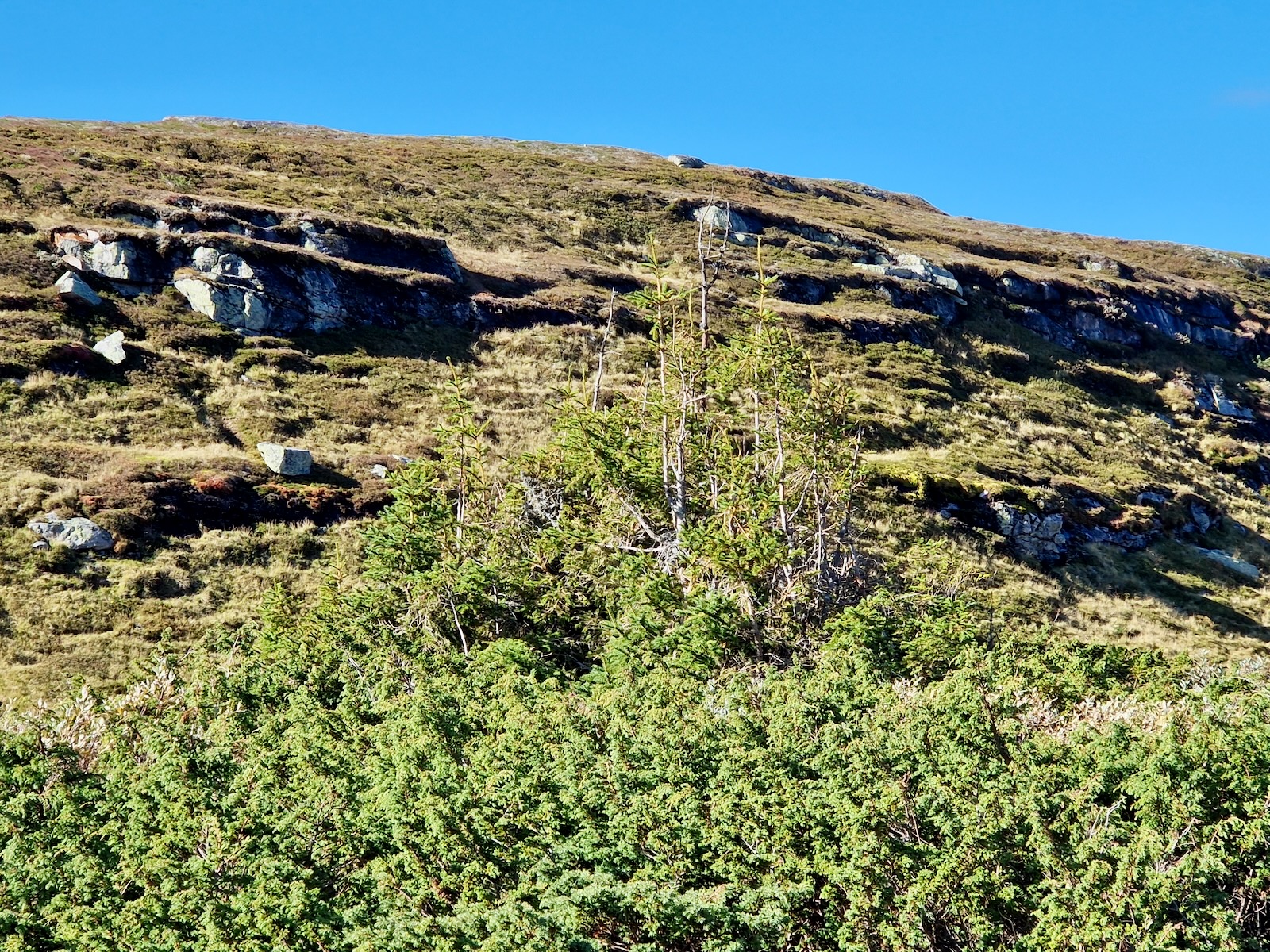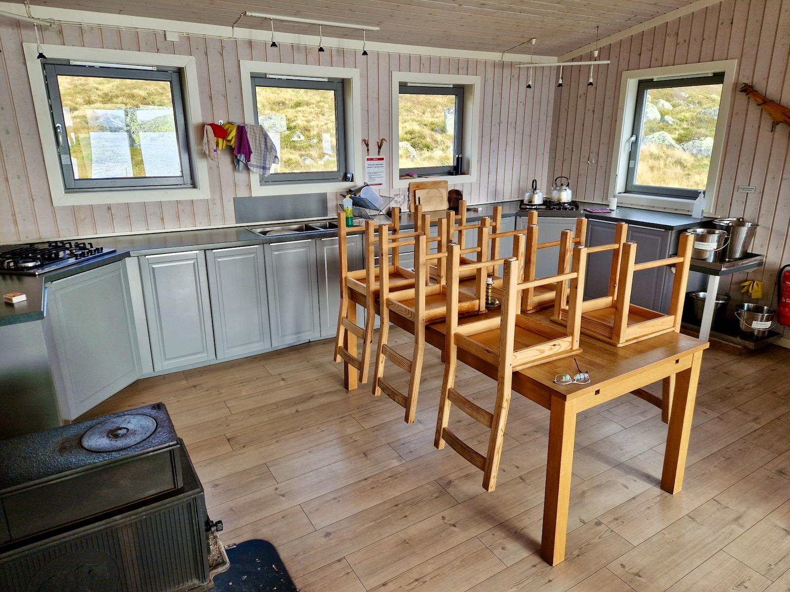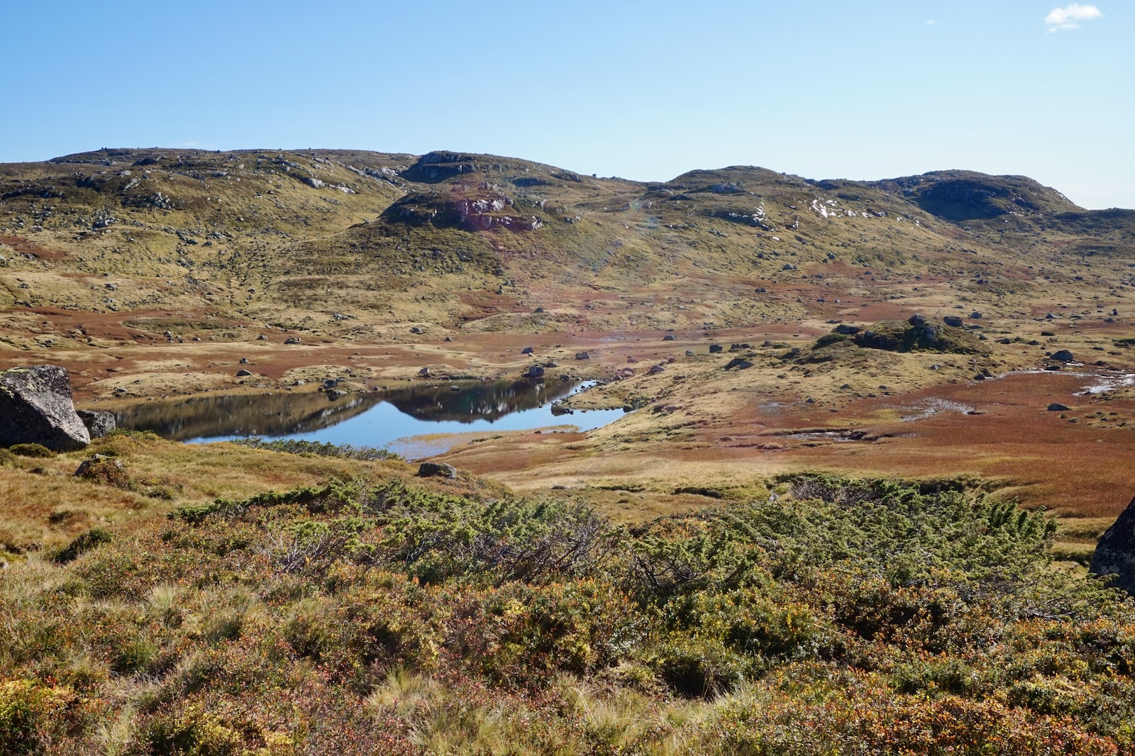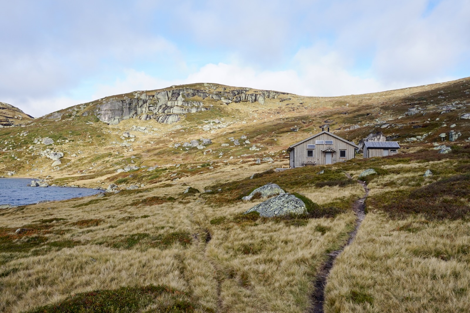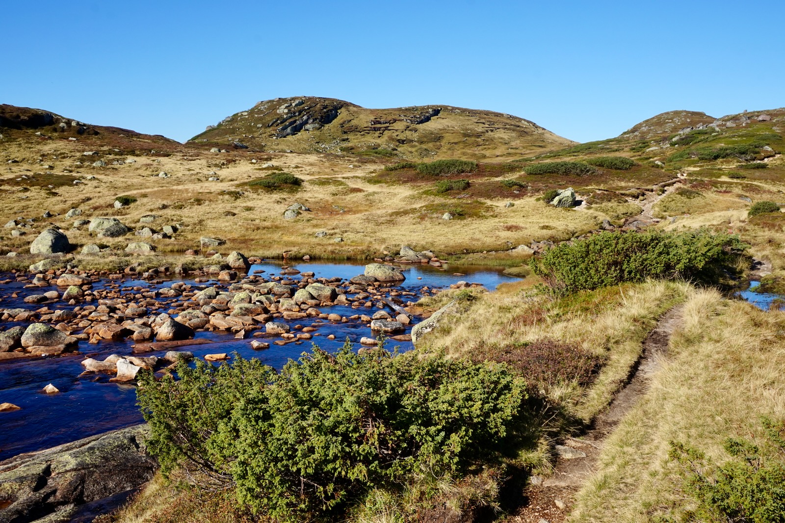 Med viss huvudvärk gav jag mig ändå i kast med stigningen upp från Valle och upp mot Dnt-hyttan Bossbu. Ifrån bilparkeringen skulle det vara ungefär sexhundra höjdmeter, så jag tog det i lugn takt. Här ser jag bakåt, efter någon timmes vandring. ![]() Uppåt. Närmare bestämt så hade jag startat ifrån bilparkeringen vid Berg, lite väster om Valle, och härifrån var det cirka femton kilometer att gå upp till Bossbu. ![]() Jag tvekar lite inför vad detta fjällområde kallas. Jag landade i att denna del nog kallas Setesdalsheiene (och det ligger också väster om Setesdalen, så det låter ju lite logiskt). Men området hänger ju också ihop med Ryfylkeheiene (som kanske är mer välkänt), och andra fjällområden, och i norr fortsätter det ju oavbrutet upp mot Hardangervidda. ![]() Ungefär halvvägs passerar man den obetjänta Dnt-hyttan Stavskar, där jag stannade för en paus. Det var en blåsig dag, så det var skönt att få komma in och få lite lä. Jag tog en bild på stugan men lyckades då få ett stort stenblock att effektivt skymma nästan hela. Den lilla stugan Stavskar ligger där bakom, hur som helst. ![]() Fortfarande uppåt. ![]() Någon kilometer efter Stavskar var man uppe på lite drygt 1200 meters höjd, som var dagens högsta punkt. Därefter blev landskapet västerut lite jämnare. ![]() ![]() ![]() Ganska flott landskap, och höstfärgerna gör ju sitt till. ![]() Längst bort syns sjön Botnsvatnet, vid vars hitersta ände Dnt-hytten Bossbu ligger. ![]() ![]() ![]() Framme vid Bossbu äntligen. I den mindre hytten till höger bodde en far och dotter ifrån Tyskland, och i stugan till vänster bodde jag den här natten, tillsammans med två trevliga karlar från Oslo som var på tur tvärs genom området. Deras mål var Lysebotn vid Lysefjorden, som de nådde någon vecka senare. ![]() Nyss inkommen i stugan. Bossbu byggdes för ett tiotal år sedan, och är väldigt funktionell. Och fin! ![]() Så fin! Värmen efter tidigare gäster hängde fortfarande kvar i stugan, som kändes väldigt välbyggd. ![]() Dagen efter, och jag kände faktiskt inte alls för att lämna stället. Jag ville sitta här i den sköna värmen från kaminen och titta ut på busvädret utanför hela dagen. Kanske somna lite i soffan. Mina nyfunna vänner från Oslo hade lämnat stugan tidigt på morgonen, de hade en lång vandringsdag framför sig. Det var så tyst i huset. Ibland rystade vinden i stugan så att knutarna knakade, men annars var det alldeles tyst. Efter en stund tycktes vädret bli lite bättre i alla fall... och jag kunde inte längre förtränga det faktum, att om jag skulle ha någon chans att hinna gå den sträcka jag tänkt, så hade jag inte råd med några vilodagar! Jag packade så småningom mina grejer långsamt, långsamt. ![]() ![]() Snön hade lagt sig på de högre bergen där borta under natten. ![]() Till slut lämnade jag Bossbu ändå. Det var fortfarande kyligt i luften, men det skulle komma att bli en fin dag! ![]() Jag var på väg söderut mot den självbetjänta DNT-hyttan Svartenut. Det var bara lite drygt en mil dit, skönt efter stigningen igår. ![]() Men fortfarande återkom ovädret då och då, snöflingor yrde i luften när jag kom över krönet mot Auguntjørnin. Jag gick utefter sjön under någon kilometer, på en ganska besvärlig stig. ![]() ![]() Fortsatte sedan att följa denna vackra dal mot sydväst ända fram till stugan. ![]() Svartenut, där jag tillbringade natten. Det hade varit jag och en tjej ifrån Nederländerna (och hennes hund) där. Hon var väldigt trevlig, och också lite eljest! ;) Hon tyckte om att gå barfota i fjällen, och när jag förmodligen verkade lite skeptisk så berättade hon att hon till och med varit uppe på Fannaråken barfota :o Respekt från min sida – även om jag kanske menade på att man behöver ju inte göra allting bara för att det går! :D ![]() Vilket underbart höstväder! :) ![]() Dessa bilder togs på morgonen, och det spritte i benen av förväntan! Vad skulle vandringen bjuda på denna fina dag? ![]() Ja, det första som skedde var ju att jag skulle försöka korsa den här älven på ett så torrskott sätt som möjligt... Det gick inget vidare. Skorna blev genomblöta, men jag kände att det inte spelade så stor roll – så länge som det inte blir kallt så stör det mig inte så mycket om skorna blir blöta. Och denna dag värmde solen ordentligt! :) ![]() Farväl, Svartenut. ![]() ![]() ![]() Wow. Utsikten över Roskreppfjorden var fantastisk. ![]() När jag ser på dessa bilder nu i efterhand kommer jag också att tänka på boken "Hundra år av ensamhet" som jag började lyssna på den här dagen, och därefter sträcklyssnade på till slutet! En speciell bok, minst sagt. ![]() Otroligt fint. Och så ensam jag var – jag mötte ingen alls på stigarna under de sista tre dagarna. ![]() ![]() Stigen gick upp och ned i maklig takt, det var sällan stora höjdskillnader. ![]() På det stora hela var det väldigt lättvandrat. ![]() Porlande bäckar och varierad grönska gjorde mig glad! ![]() Jag följde Dnt-stigen rakt söderut mot hyttan Øyuvsbu, en vandring på cirka femton kilometer. ![]() ![]() Inte ett moln på himlen. Det är såna här höstvandringar man drömmer om! ![]() ![]() ![]() Väldigt frodigt landskap. Här är jag någonstans i närheten av Kleivi, på lite drygt tusen meters höjd – och det växte ett litet bestånd med granar mitt bland enbuskarna! Man blir ju fundersam. Undrar hur det kommer att se ut här om hundra år? Kommer hela detta område att bestå av tät granskog? ![]() ![]() Här ser jag rakt österut ner i Evardalen. Även om det känns som att jag är långt ute i vildmarken så är det bara fem kilometer ner till en bilparkering åt det hållet. ![]() Här har jag klarat av en av dagens högsta stigningar (som ändå inte var mer än 150 meter), och fick lite utsikt mot det kargare landskapet i väster. ![]() ![]() ![]()